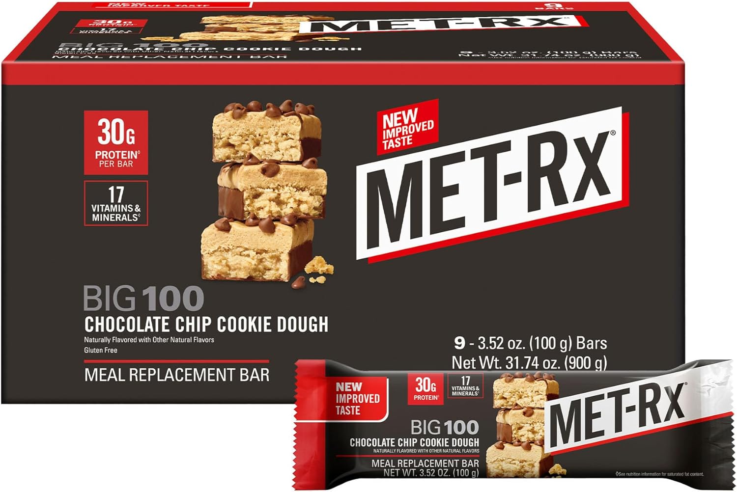 MET-Rx Big 100 Colossal Protein Bars, Chocolate Chip Cookie Dough Meal Replacement Bars, 9 Count (Pack of 1)