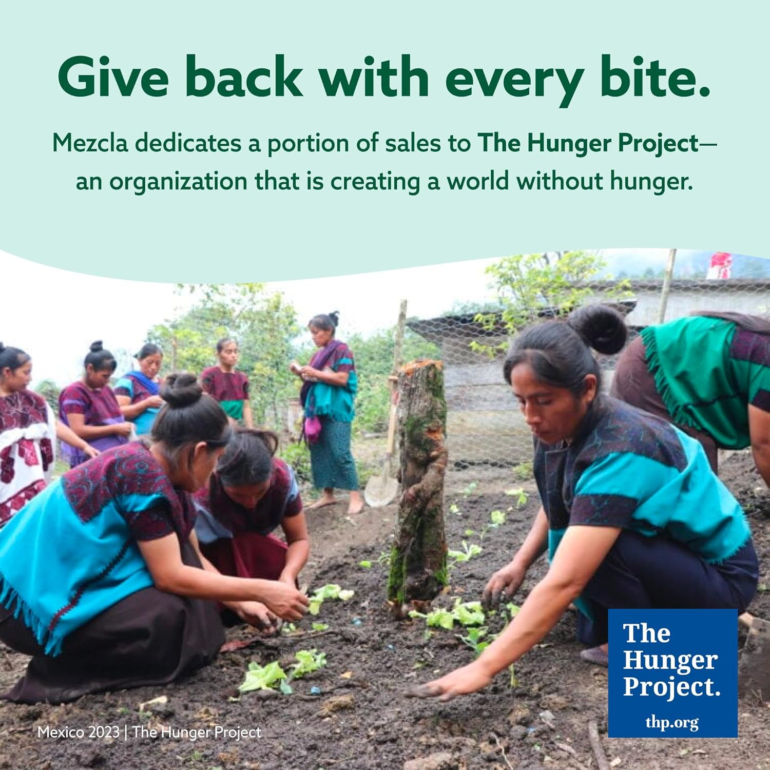 EACH BAR GIVES BACK: Mezcla is dedicated to making a positive impact in communities around the world. Partnering with The Hunger Project, a global non-profit committed to ending world hunger by 2030, Mezcla donates a proceed of bar sales to support their efforts.