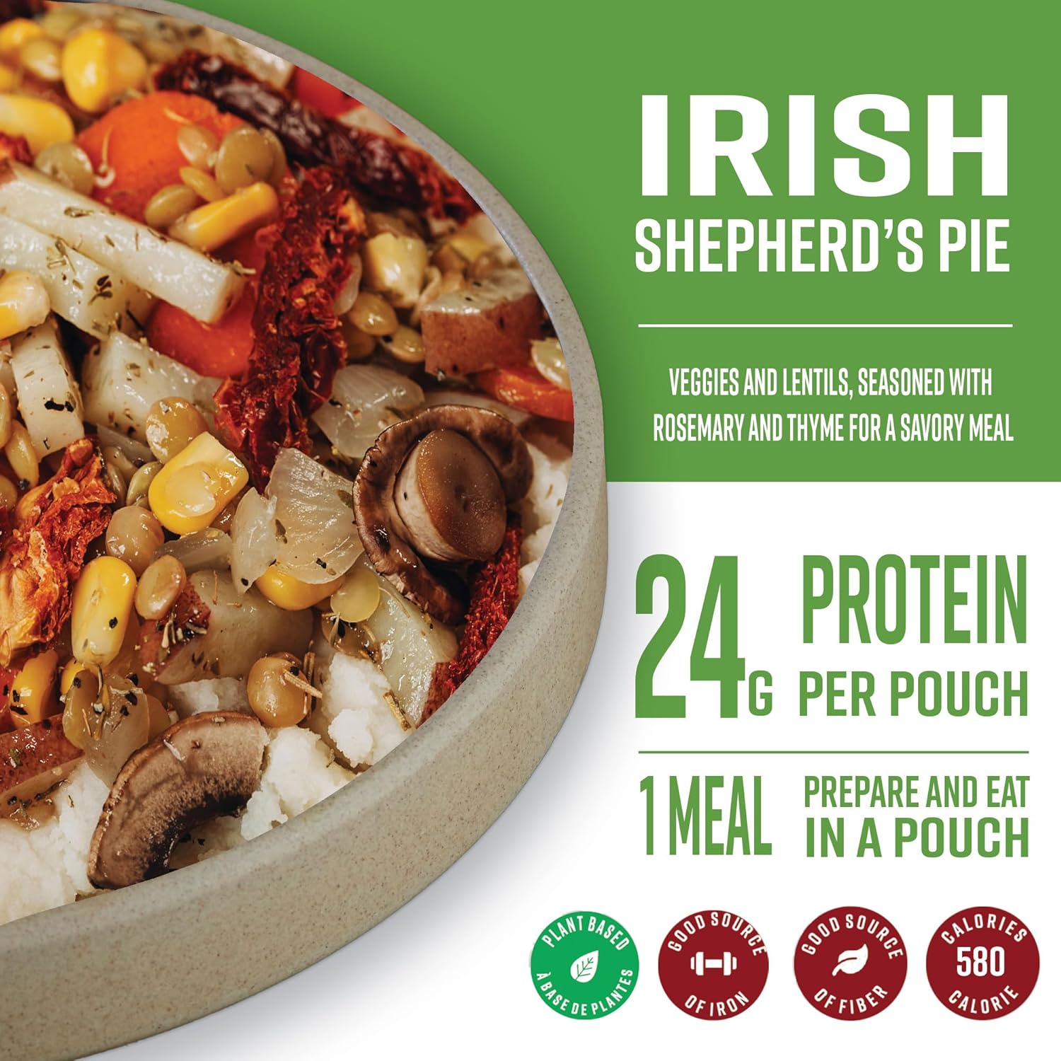 Vegan Delight – A plant-based twist on classic Irish Shepherd’s Pie, featuring wholesome ingredients like lentils and vegetables. Perfectly crafted to fuel your outdoor adventures with a delicious, hearty meal that’s as nourishing as it is satisfying!
