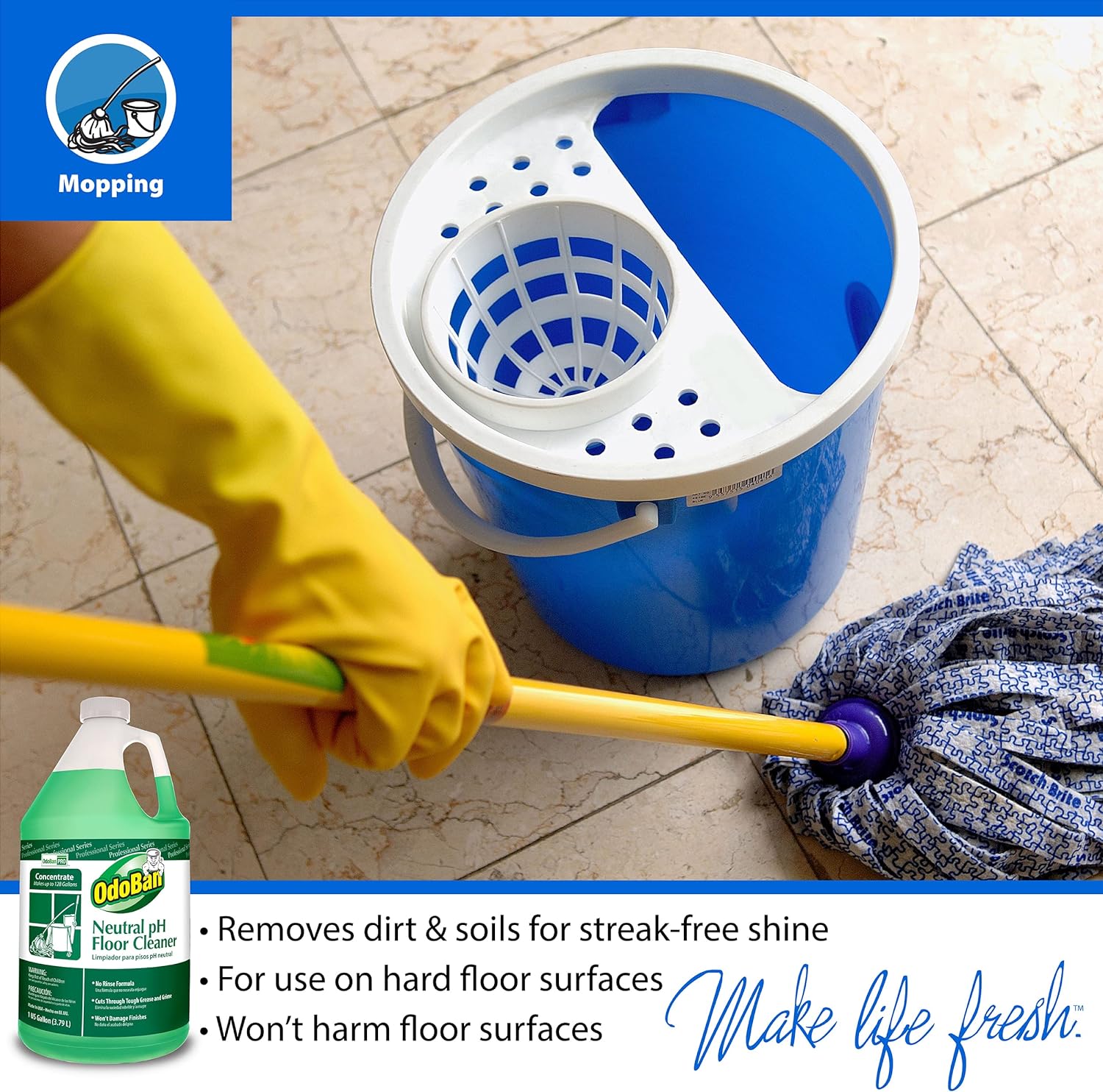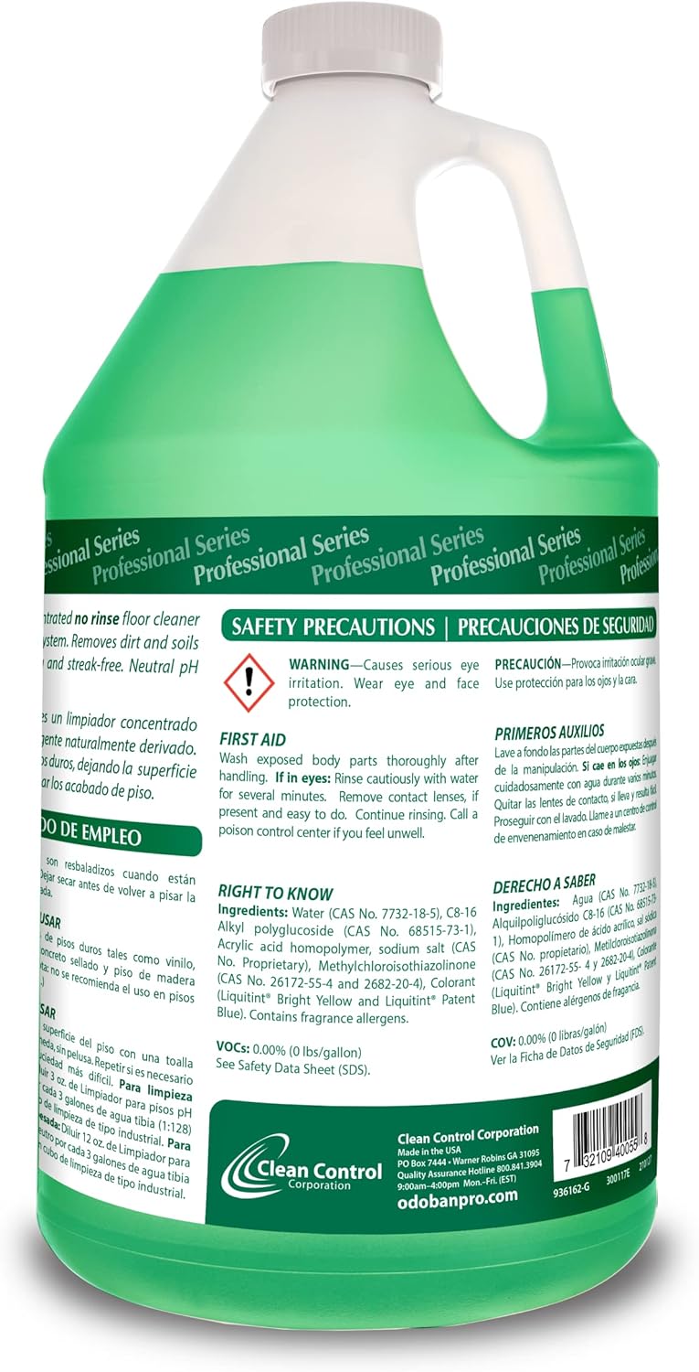 Protect high-traffic areas and more in your home or place of business with the OdoBan Professional Series Neutral pH No Rinse Floor Cleaner Concentrate. Our effective formula is streak free, leaves no residue, and has a refreshing and invigorating, yet light citrus scent. It can be used on a multitude of floors including sealed woods, laminates, tiles, asphalt tile, rubber, sealed concreate and more as well as other surfaces including toilets and sinks, glass, and even countertops. It is not recommended for unfinished wood or oiled wood. The neutral pH formula is harmless to finishes and does not leave a sticky residue behind. Each gallon of concentrate makes up to 128 of cleaning solution. Make Life Fresh with OdoBan.