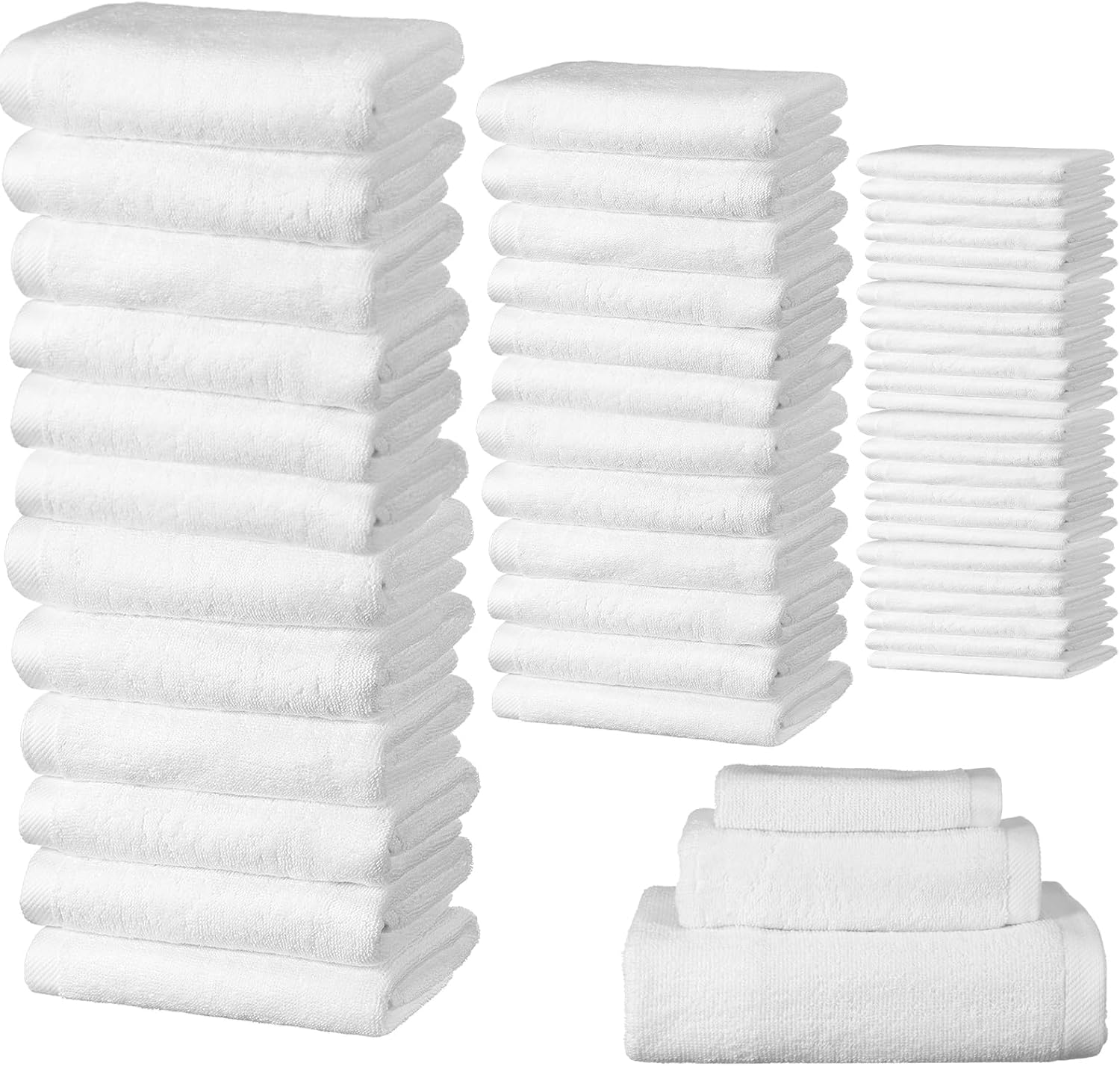 3 Styles and 3 Sizes: the microfiber bath towels bulk have 3 different sizes; Set includes 12 bath sheets (27 inch x 55 inch), 12 hand towels (16 inch x 28 inch) and 24 wash cloths (12 inch x 12 inch); You can use them to dry your body, hair and skin, which can give you a warm use experience