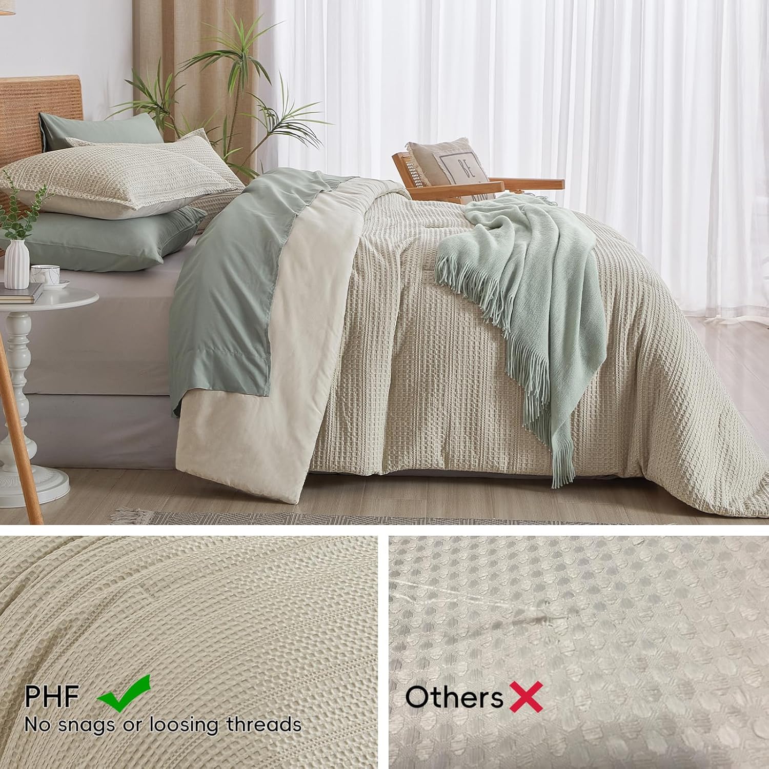 Waffle Weave Design: PHF Waffle Comforter Set features innovative 3D weaving technology that perfectly blends classic waffle texture with modern craftsmanship. The 1.8mm dimensional grid depth combined with precisely engineered 52-degree diagonal stitching creates a distinctive waffle aesthetic. The unique waffle design delivers an sophisticated elegance that complements any bedroom style – whether modern, rustic, farmhouse or minimalist decor – elevating your sleep space with luxurious style.