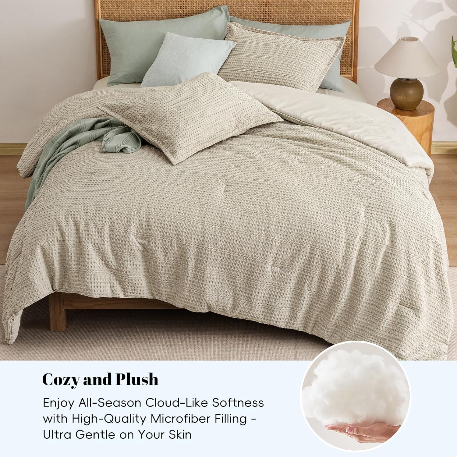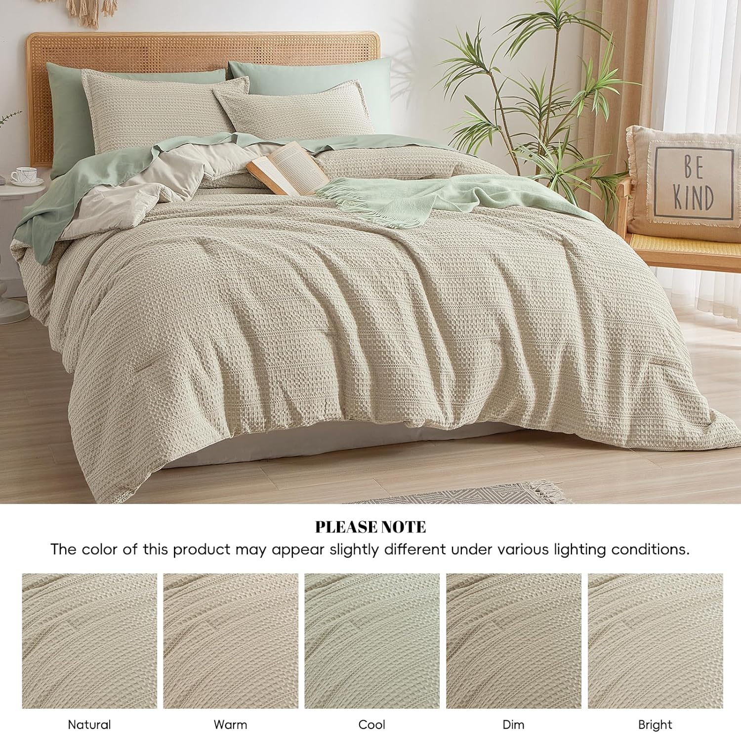 What You’ll Get: Queen bedding set includes 1 comforter 90″ x 90″, 2 pillow shams 20″ x 26″, fits Full/Queen sizes bed. Our waffle comforter is packaged in a vacuum bag. To restore its cozy and fluffy feel after unpacking, simply tumble dry on low heat or gently tap the comforter while basking in the sun to fluff it up.