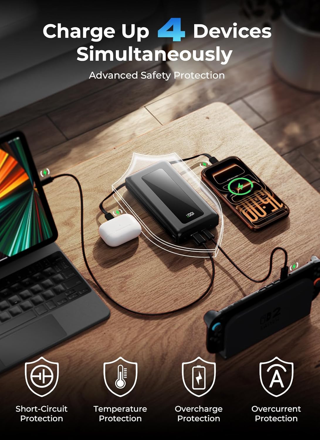 Portable Charger with Built in Cable: This portable charger power bank includes two built-in cables (iOS & USB-C) plus extra USB-A and USB-C ports, letting you charge up to four devices at once. It powers your iPhone, Samsung, iPad, drones, or handheld gaming consoles with ease. Perfect for sharing with friends, coworkers, or family during travel, commuting, road trips, or daily use—an essential on-the-go charging solution.