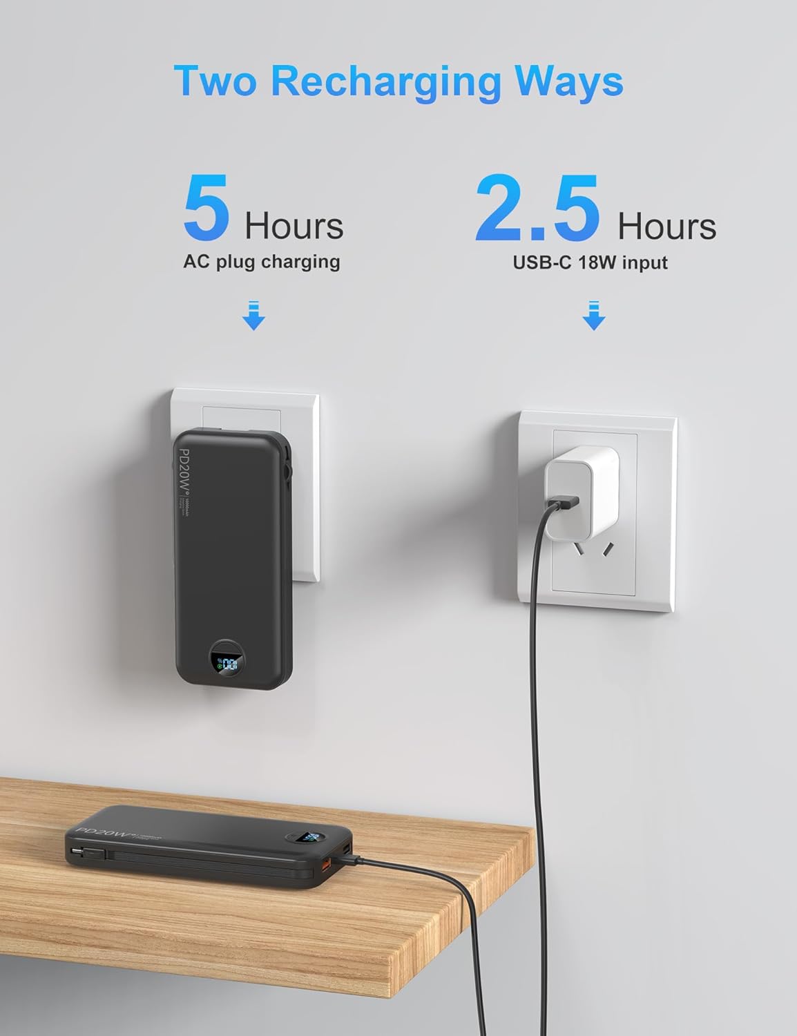 Dual Recharge Methods: AC input needs 5 hours to fully charge this portable charger, while only 2.5 hours via the 18W PD USB-C input port. Smart LED digital screen clearly shows the remaining power; the intelligent chip protects the portable charger against overcharging, short circuit, overvoltage, overcurrent and overdischarging.