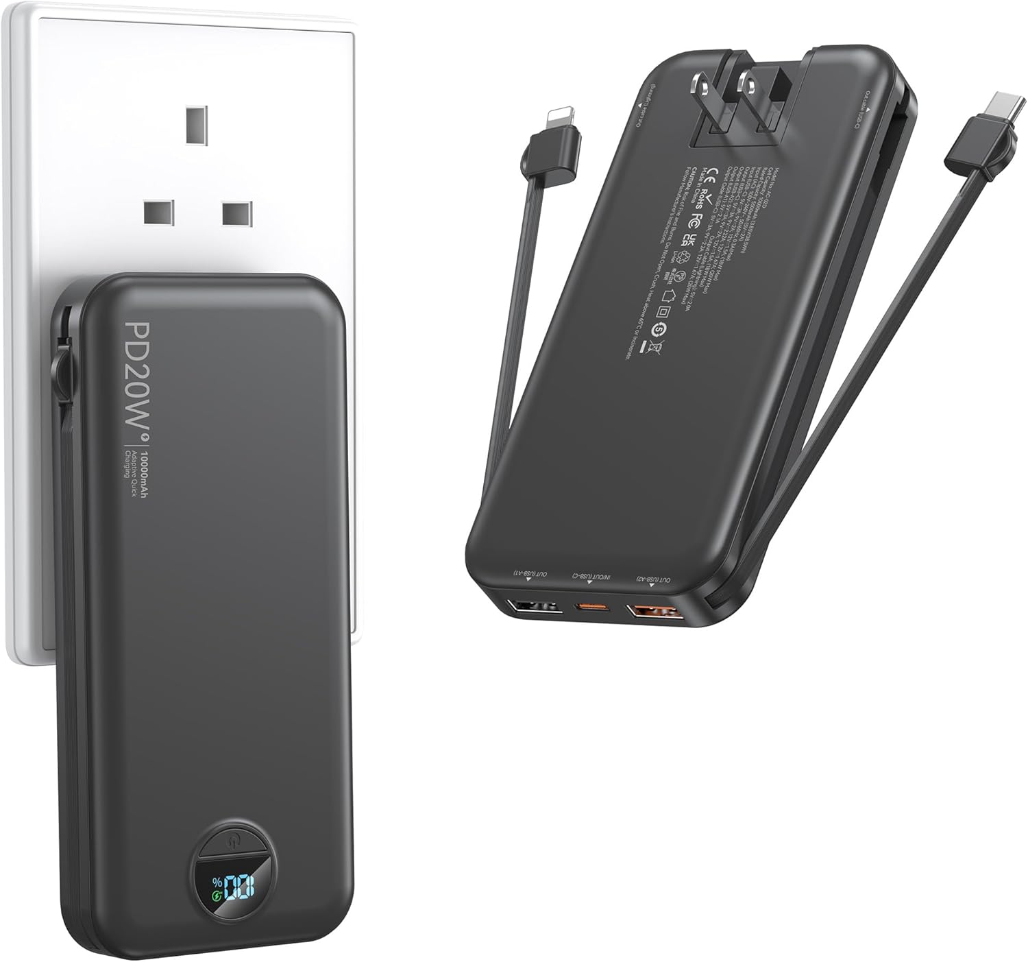 Portable Charger with Built in Cables: portable phone charger built in USB C and for Phone cables, the AC wall plug allows you to recharge this power bank from wall outlet, no need other cord and adapter wherever you go, camping, traveling essentials, excellent gifts for men women daily working or vacation.
