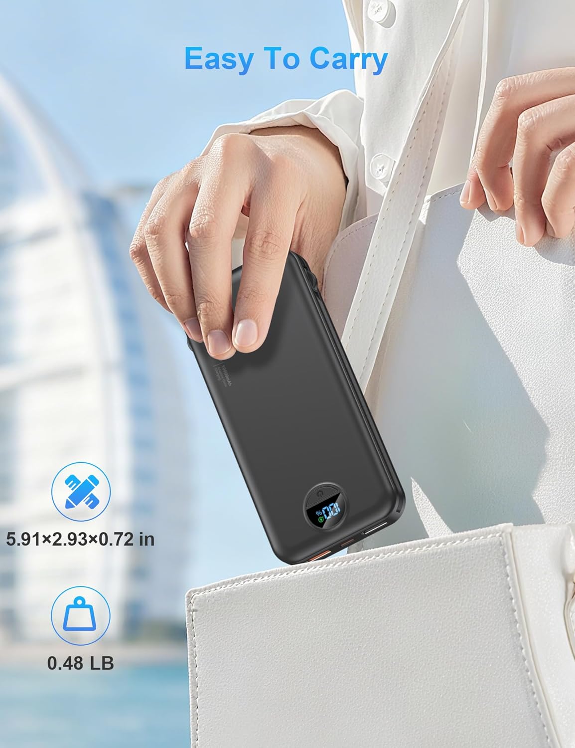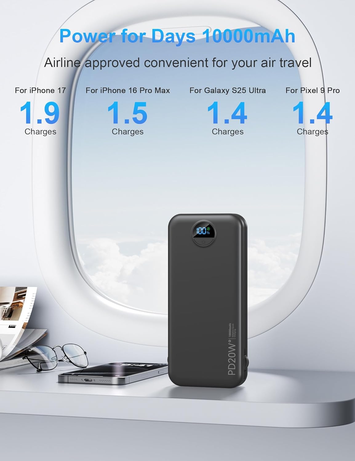 Small Size but High Capacity: This portable battery pack has the compact 5.91 x 2.93 x 0.76 inch size, 0.48LB weight, effortless to carry. 10000mAh power bank can charge for iPhone 17 1.9 times, for iPhone 16 Pro Max 1.5 times, for Galaxy S25 Ultra 1.4 times, for Pixel 9 Pro 1.4 times, let your device full of energy.