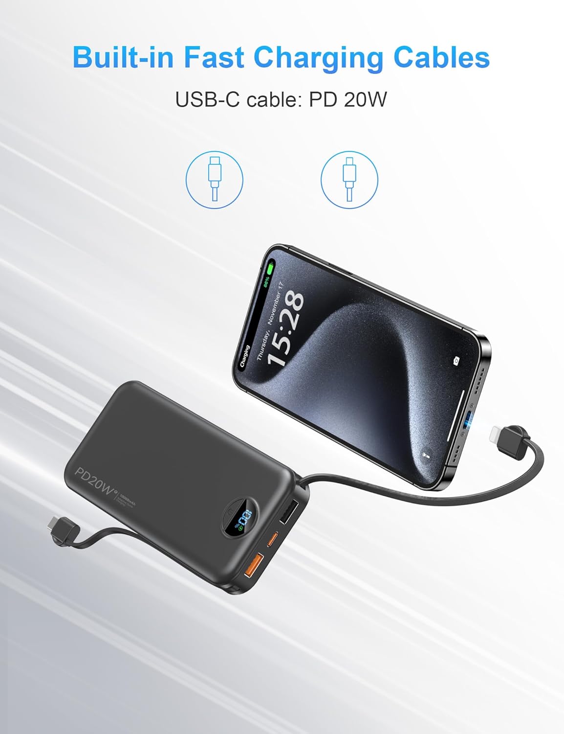 High Speed Battery Bank: USB C output port can fully charge Phone 17 within 1.7 hours, the inbuilt Type C cable supports 20W Power Delivery (PD), charge Galaxy S25 Ultra to 50% in 45 minutes, USB-A2 only needs 1.5 hours to charge Phone 14, our portable charger can charge 5 devices simultaneously.