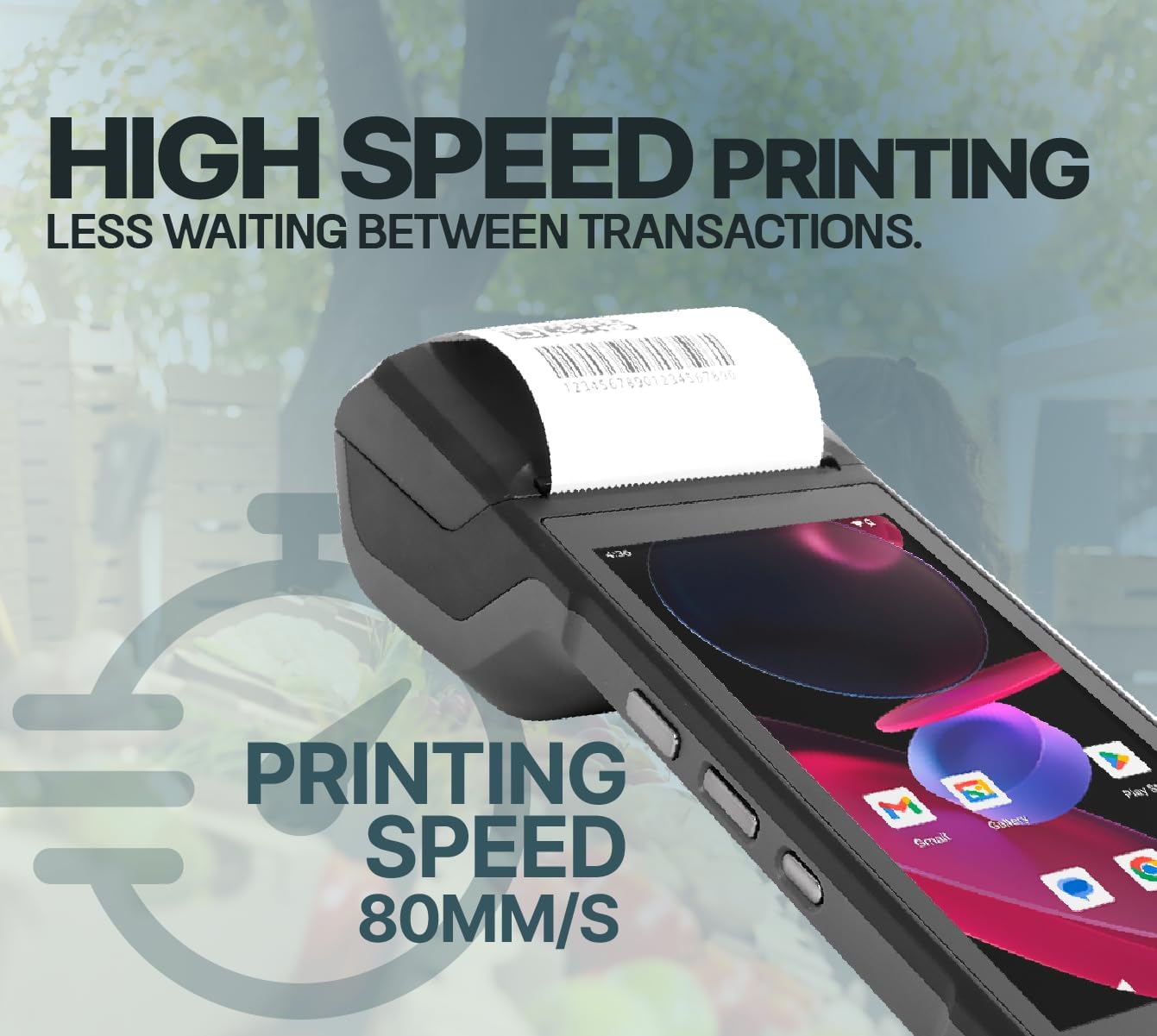 Integrated High-Speed Receipt Printer: Features a built-in 58mm Thermal Printer with 80mm/s speed, providing a true All-in-One solution for quick and mobile receipt issuance. Eliminates the need for external, bulky printing peripherals.