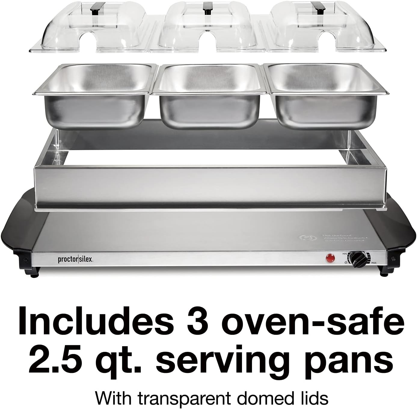 With the Proctor Silex® Triple Buffet Server, you can serve warm food 3 different ways. Serve from the 3 included oven-safe chafing pans. Serve appetizers right from the warming tray. Or serve food in your own heat-safe dishes kept warm on the tray.