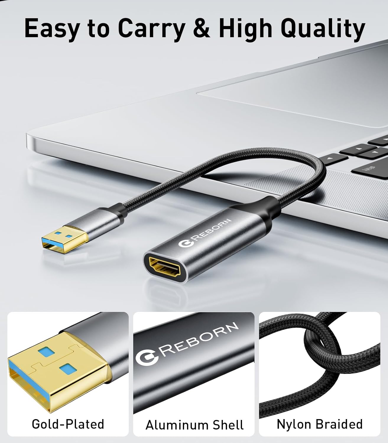 Reborn USB to HDMI adapter : The Reborn USB to HDMI adapter, a powerful device, converts USB to HDMI, facilitating connections to HDMI displays. Vital for laptop screen output and multimedia, its compactness ensures convenient carrying and instant connection. Note: This adapter cannot be used in BIOS mode, and the driver needs to be installed. If other drivers (e.g., for USB-to-VGA adapters) are installed, uninstall them first to avoid conflicts.