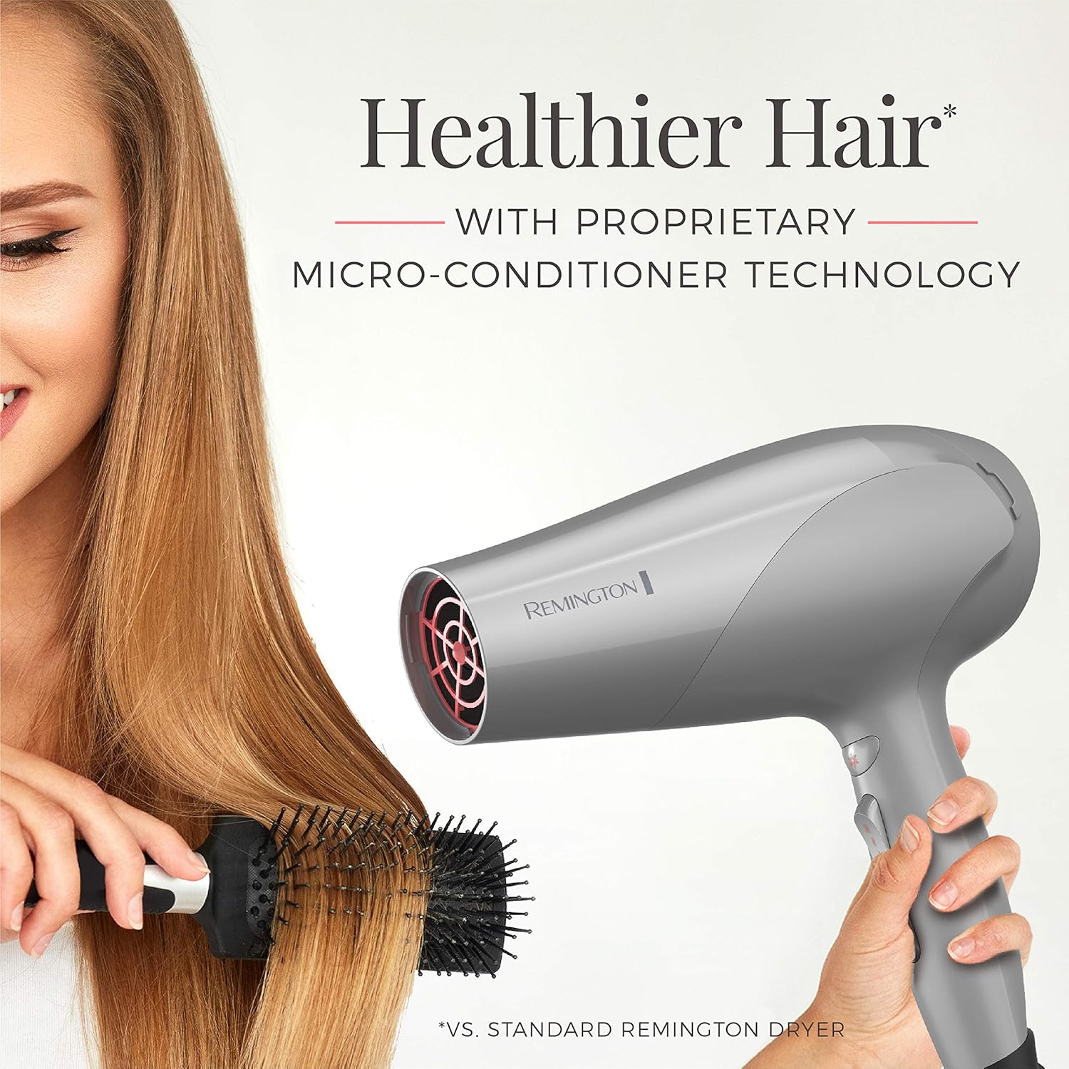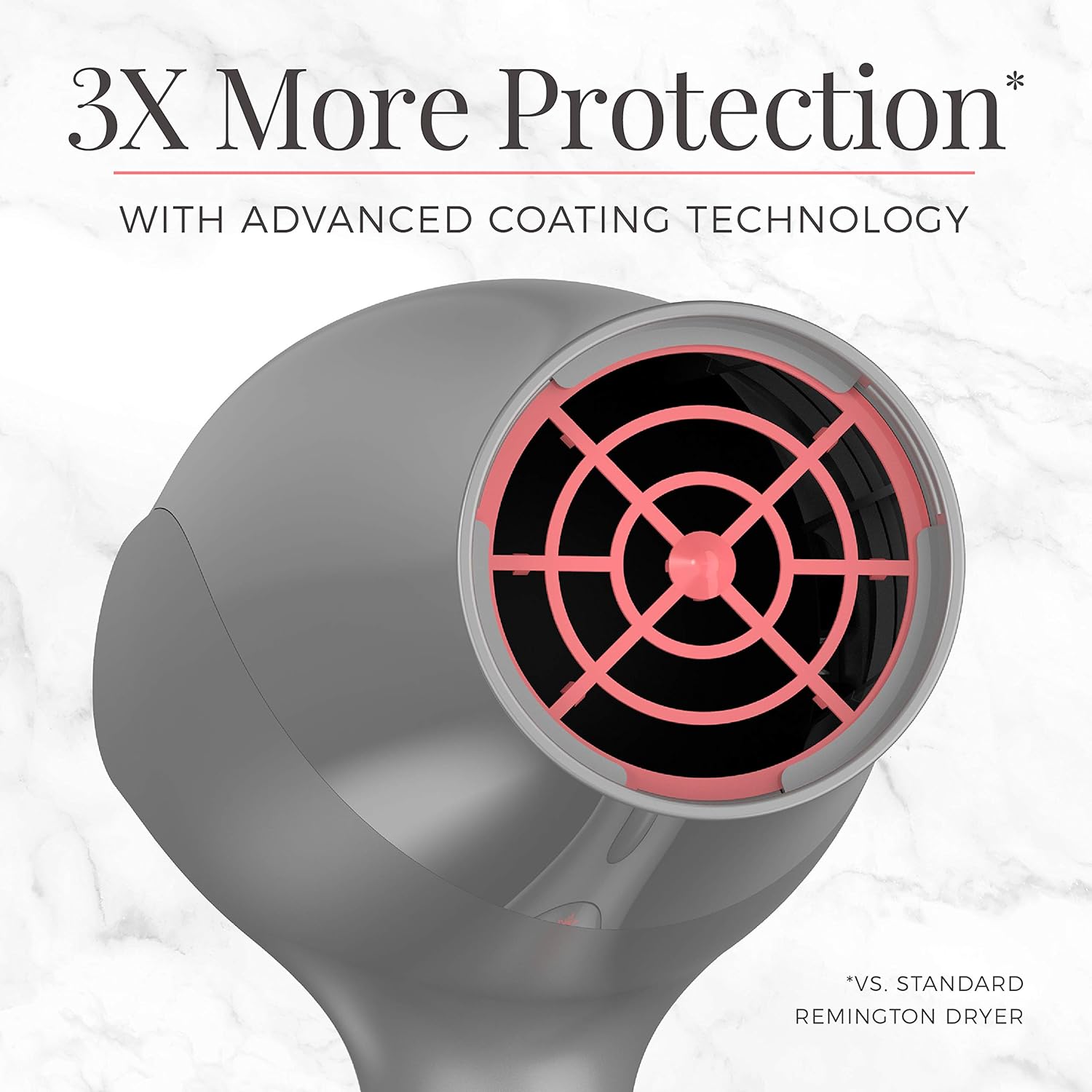 Achieve shiny, healthier hair with the Remington damage protection Hair dryer. The advanced coating technology offers 3x more protection during styling, and our proprietary micro-conditioner technology keeps your hair healthier. This dryer combines ceramic + ionic + Tourmaline technologies with 1875W Max power for fast, healthy styles and less frizz. With three heat and two speed settings, you can find the airflow performance you prefer for your hair type. Then lock in your gorgeous styles with the cool shot button. Plus, the concentrator and diffuser attachments make it easy to style with precision or build volume and lift while you dry your hair. Vs. Standard Remington dryer.