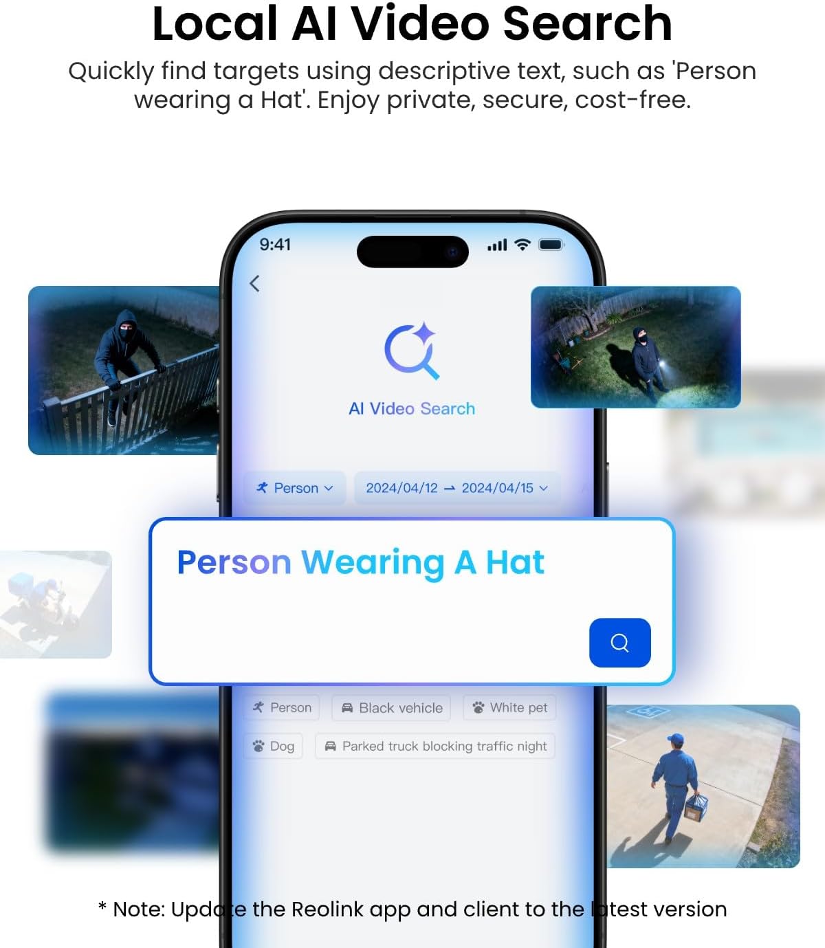 Local AI Footage Search: Enter descriptive text, such as “person wearing a hat,” to quickly search for the target in locally stored alarm footage, improving security response speed and decision-making efficiency. All search processing is performed locally on the device, ensuring privacy and no additional fees.