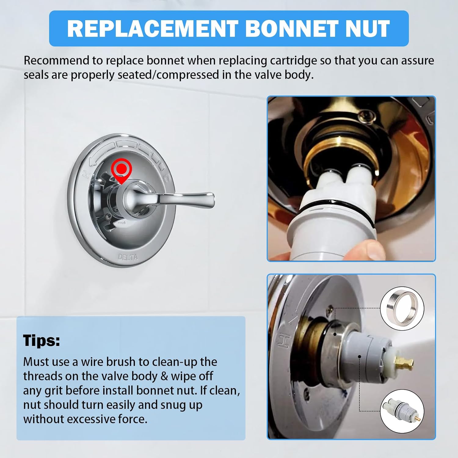 Easy to install and repair the leaking delta tub faucet, no need to replace the entire faucet.It’s suggested to replace bonnet when replacing cartridge so that you can assure seals are properly seated/compressed in the valve body.