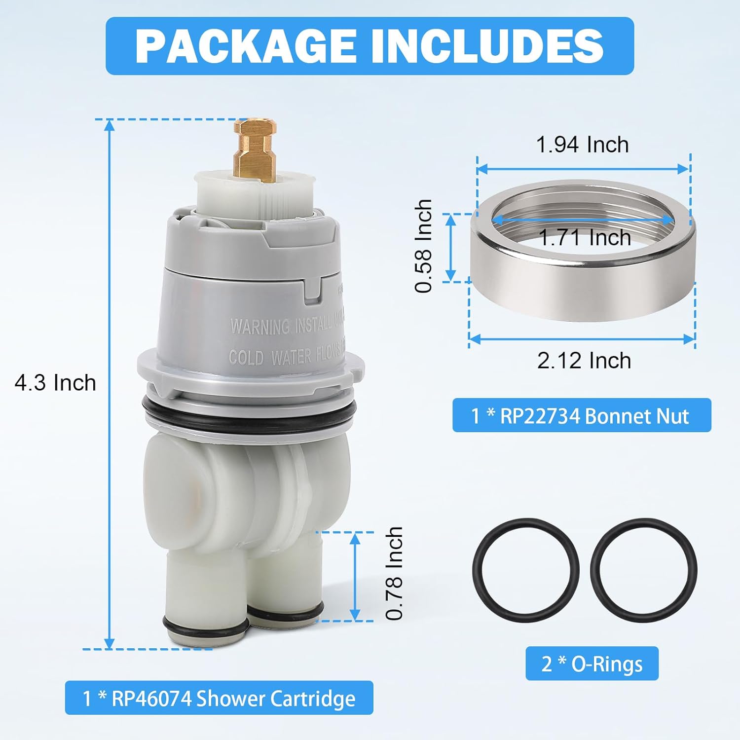 The RP46074 valve cartridge adopt pressure balance design, single function pressure balance temperature control, can keep the water temperature within a safe range of ±3.6°F (±2°C) that is safe for the human body, helping to protect you from sudden changes in the pressure of cold or hot water when showering.