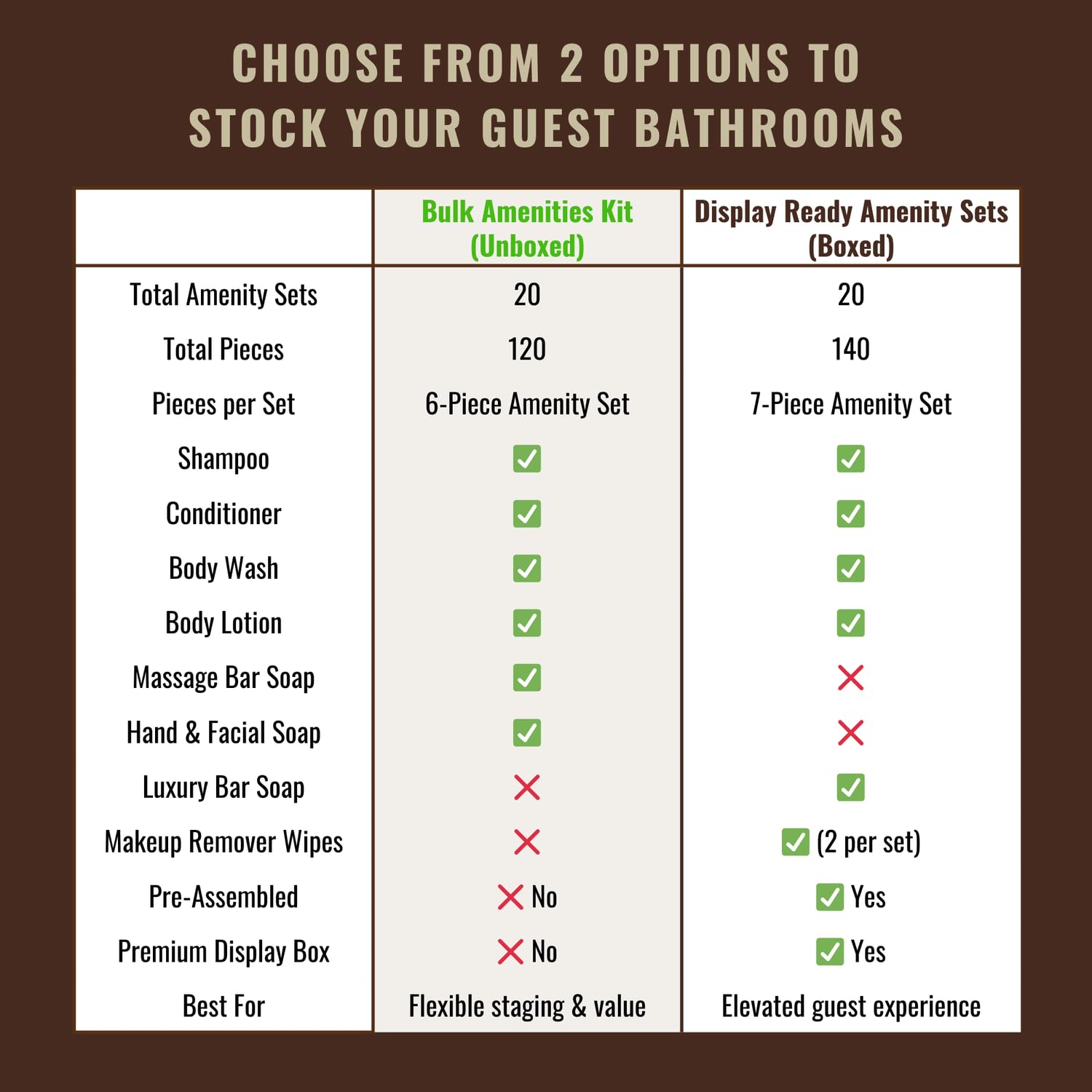 Selecting “Unboxed Bulk” delivers unassembled amenities packaged together in one box. Selecting “Boxed display ready” delivers pre-assembled kits in premium display boxes.