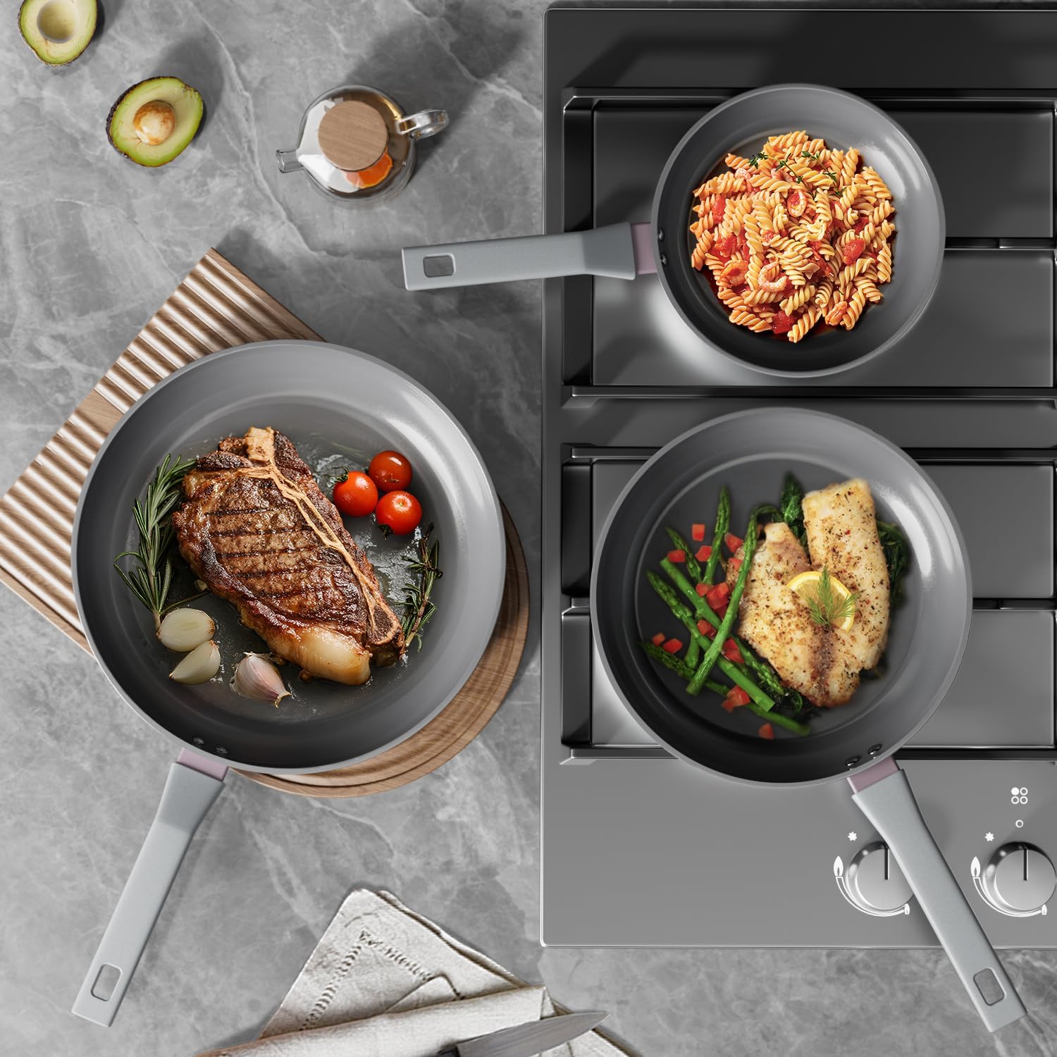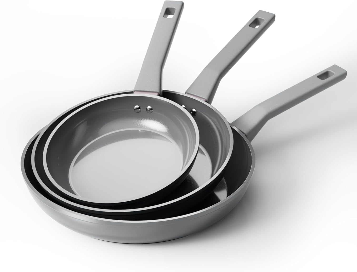 【Ultimate Easy Clean & Dishwasher Safe Design】The ultra-smooth, non-porous ceramic surface resists stains and food residue. For daily convenience, the entire pan set is dishwasher safe. The innovative ceramic-reinforced base also resists discoloration and scuffing from stovetop grates, keeping your pans looking newer, longer