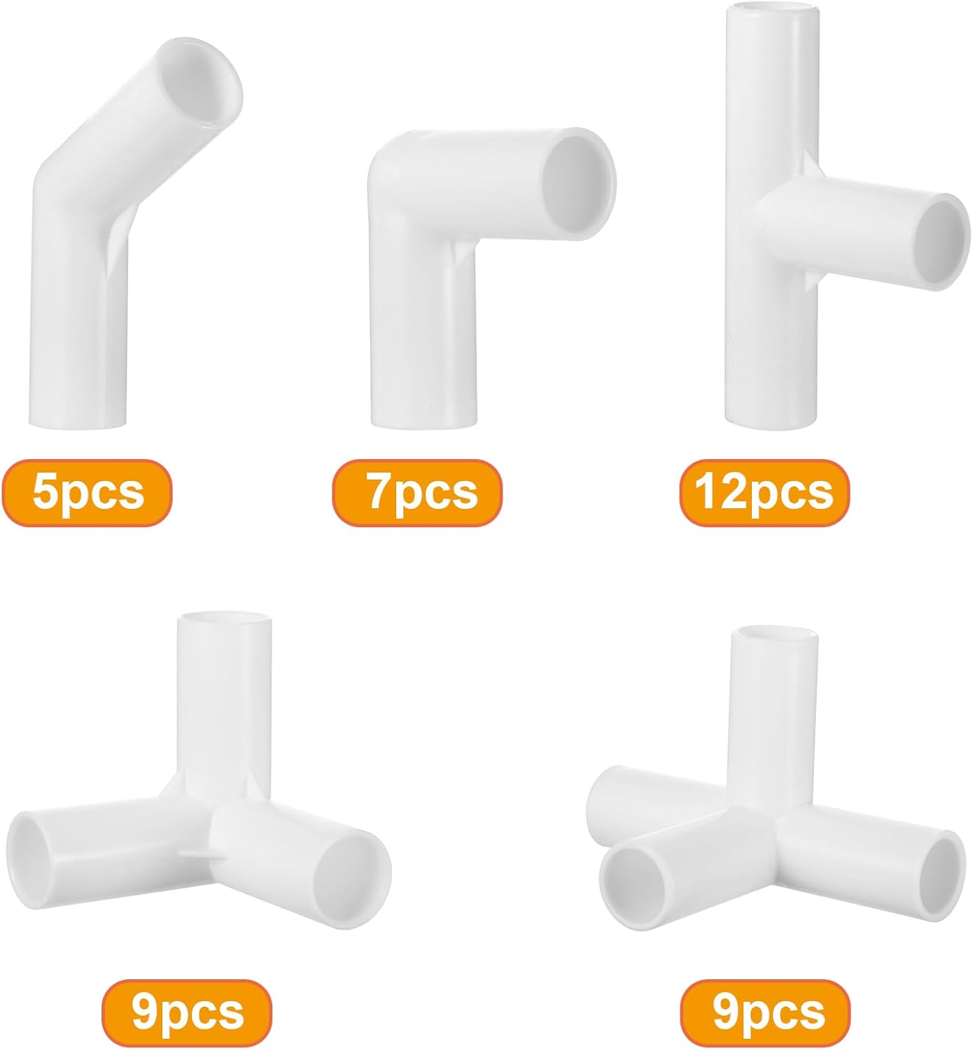 Abundant Quantity: our DIY PVC projects will receive 60 pieces of 1” diameter, 23.6” long PVC pipe, 42 PP material connecting pipe combination, including 4 120-degree elbows,4 three-dimensional five way joints,6 90-degree elbow joints,8 three-dimensional tees,8 three-dimensional four way joints and 12 flat tees for various DIY projects