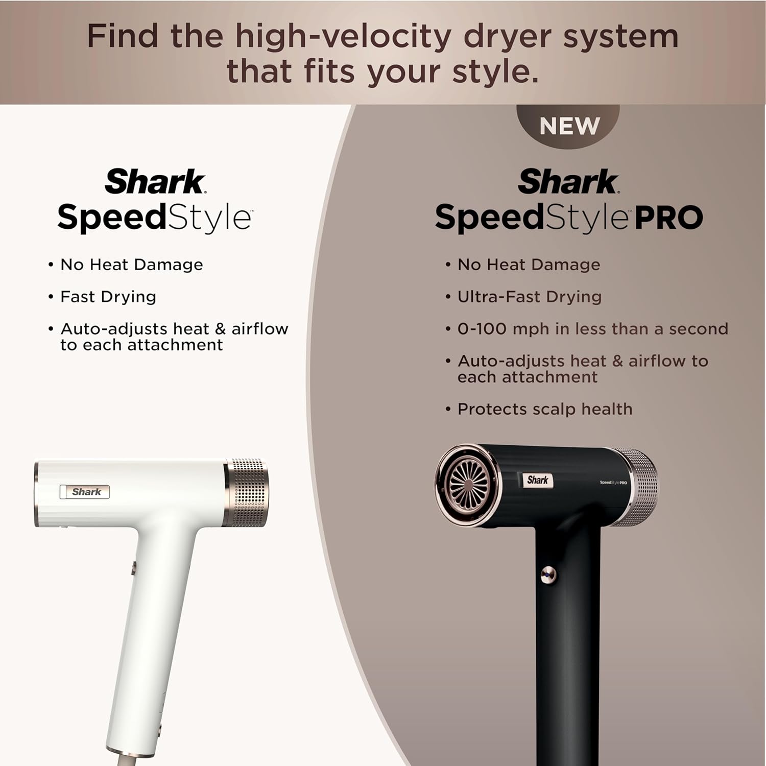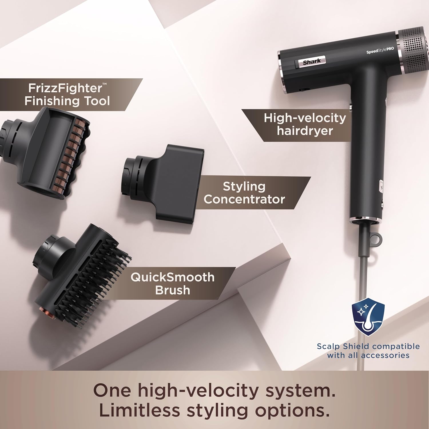 Meet the Shark SpeedStyle Pro Hair Dryer System. Designed for professional power and no heat damage for salon-quality results at home on straight and wavy hair. Achieve sleek or voluminous, high-shine looks on wet-to-dry hair with high-velocity airflow that goes from 0 to 100 mph in less than a second. Includes Scalp Shield — designed to protect new hair growth from extreme heat.