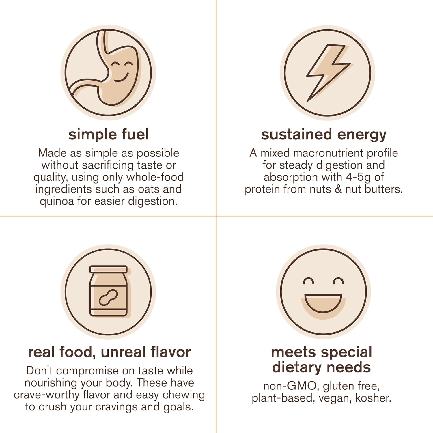 PEANUT BUTTER + CHOCOLATE: Chocolate and creamy nut butter with a touch of sea salt – has there ever been a more perfect combination? These whole food bars are healthy, clean, and provide complex carbs compared to the leading protein bars or granola bars.