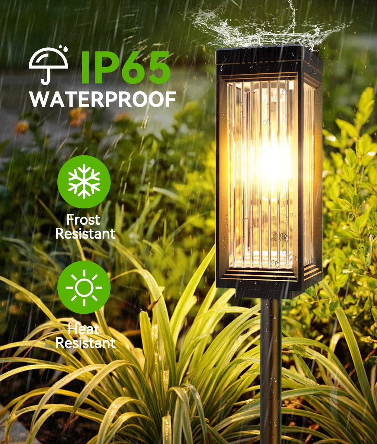 【3 HEIGHT OPTIONS & IP65 WATERPROOF】 The solar landscape lights come with the extra pole so you can set it lower or higher. These solar pathway lights outdoor feature a thickened frosted PC lampshade and a UV-resistant ABS light pole for exceptional durability performance. With a sealed IP65 waterproof rating, the solar powered outdoor lights resist rain, snow, heat, and harsh sunlight—ensuring reliable operation in all seasons. The premium materials of solar garden lights outdoor prevent fading and cracking, making these solar yard lights a worry-free choice for year-round outdoor landscape lighting and decoration.