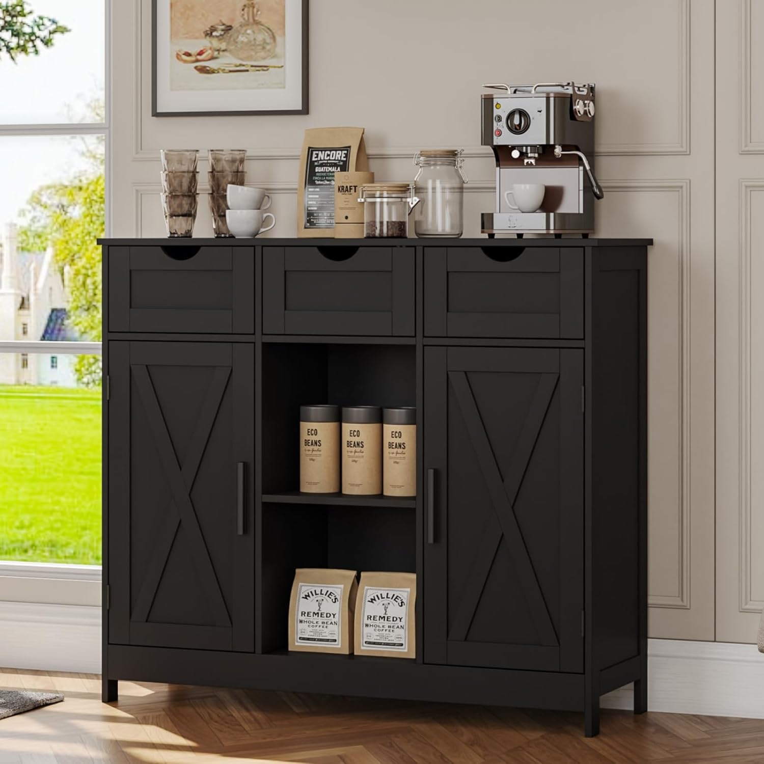 Storage Cabinet, Coffee Bar Cabinet with 2 Adjustable Shelves, 3 Drawers, and 2 Doors, for Bathroom, Kitchen, Living Room (Black)