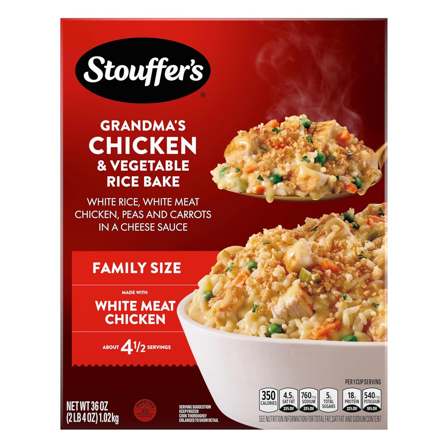 One 36 oz box of Stouffer’s Family Size Grandma’s Chicken Vegetable Rice Bake Frozen Meal. EBT item in eligible states