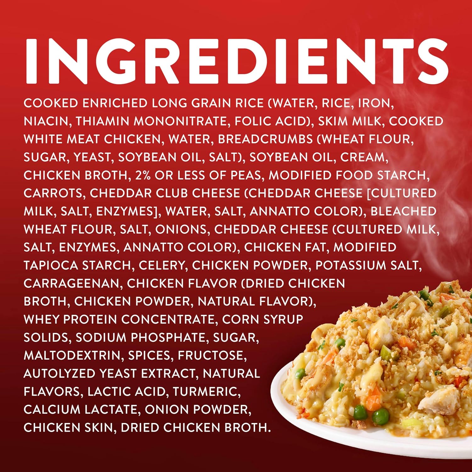 This Family Size frozen meal includes rice, white meat chicken and vegetables in a real cheddar cheese sauce
