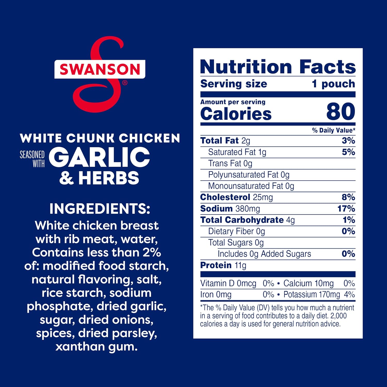Swanson Garlic and Herbs White Chunk Fully Cooked Chicken, Ready to Eat, Simple On-the-Go Meals, 2.6 OZ Pouch