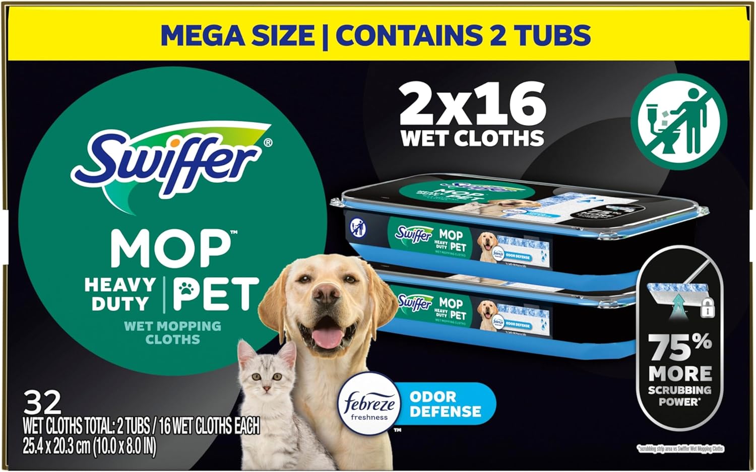 Swiffer Sweeper Heavy Duty Pet Wet cloths have a built-in dirt magnet strip to make cleaning dirt and paw prints easy. Dirt and pet messes get trapped and locked deep into the pad. It’s a quick and convenient way to keep up your floors, and your pets!