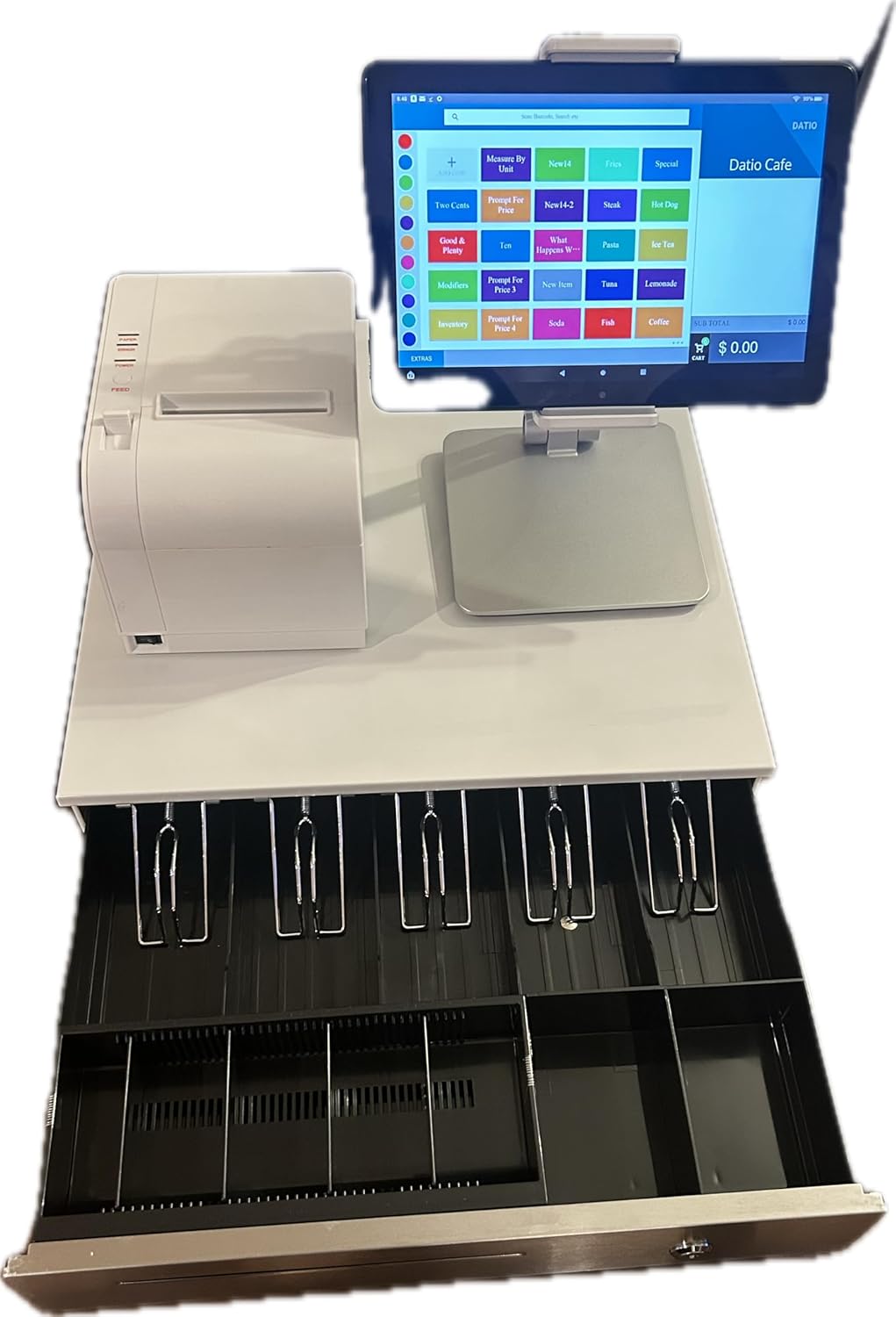Upgrade your checkout experience with the Datio POS System for Tablets in white – the perfect all-in-one hardware bundle for retail shops, restaurants, salons, cafes, and other small businesses. Built for speed, simplicity, and style, this iPad-based system includes everything you need to serve customers more efficiently. This white bundle includes: An Tablet register base (fits iPads from 9.7″ to 10.x”) High-speed thermal receipt printer (no ink or toner required) Locking cash drawer with compartments for bills and coins Power and connection cables Designed to work exclusively with the Datio POS app (subscription required), this solution offers inventory control, employee management, sales tracking, receipt printing, and more. Note: iPad not included. Requires monthly software subscription. Perfect for fast-paced businesses that need a reliable, compact, and clean-looking register system.