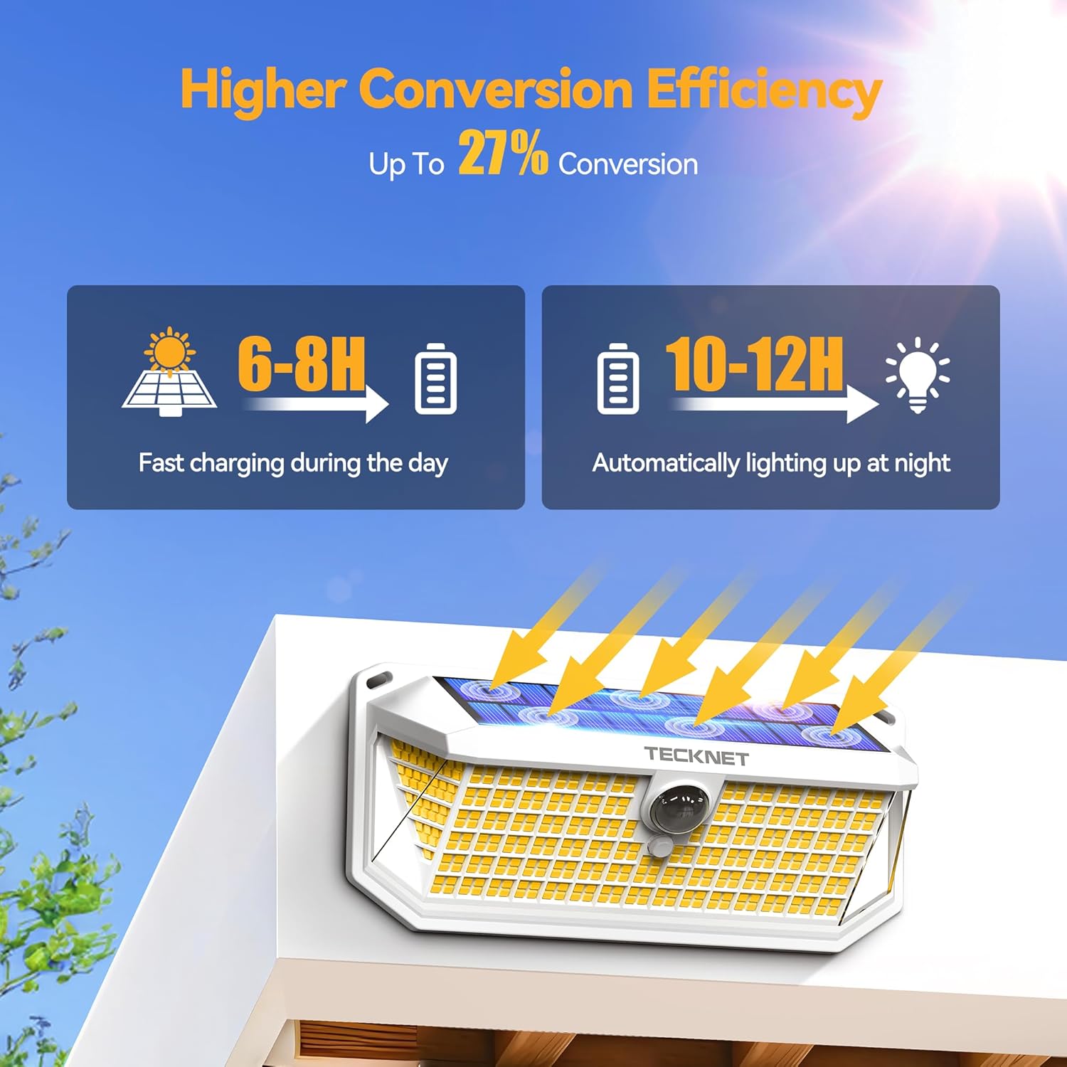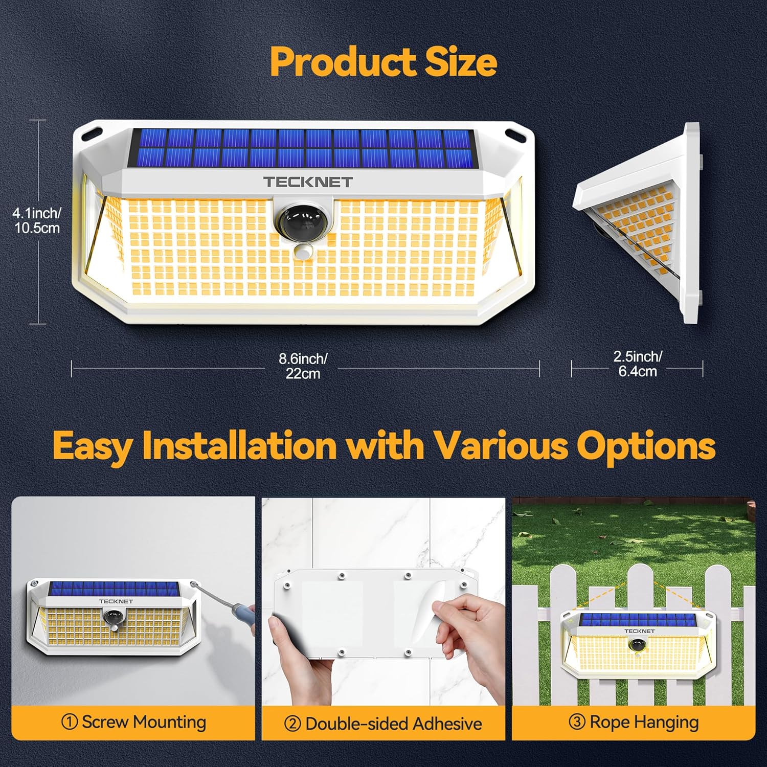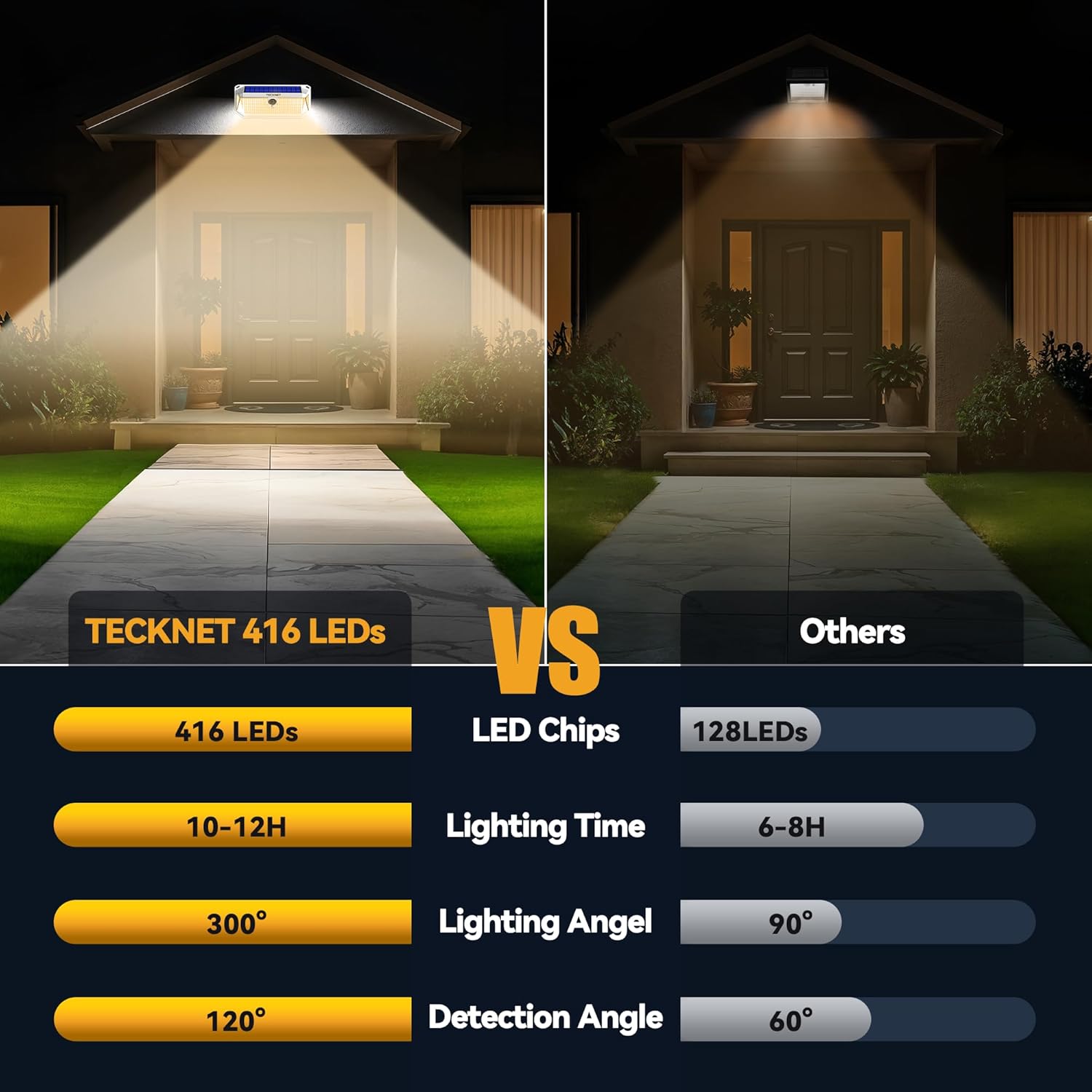 416 LEDs for Enhanced Brightness: TECKNET’s outdoor motion lights feature 416 LED beads and a unique reflective light structure design that reduces light loss, ensuring increased brightness. Unlike products in the market with fewer lamp beads and one-sided lighting, our 416 LEDs solar motion lights provide three-sided lighting for brighter illumination across a wider range, effectively lighting up your backyard, garage, front door, stairs, and more