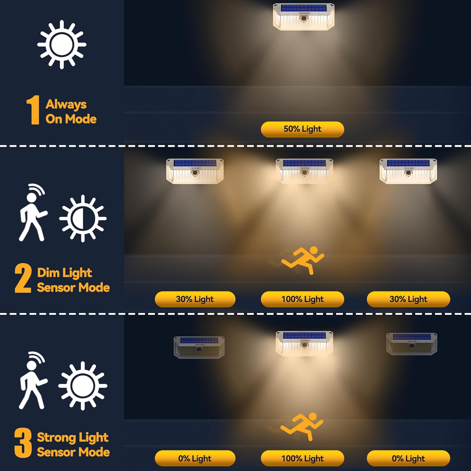 3 Lighting Modes: TECKNET solar motion lights outdoor offer 3 modes to cater to various needs: continuous medium-light for all-night illumination, dim-to-bright light transition, and sensor motion mode (from no light to high light). When you select the always-on mode, the light will turn on at dusk and go off after dawn, allowing you to judge the time by the light. When you use the motion sensing mode, you can save the power of solar motion lights outdoor and extend the working time of light.