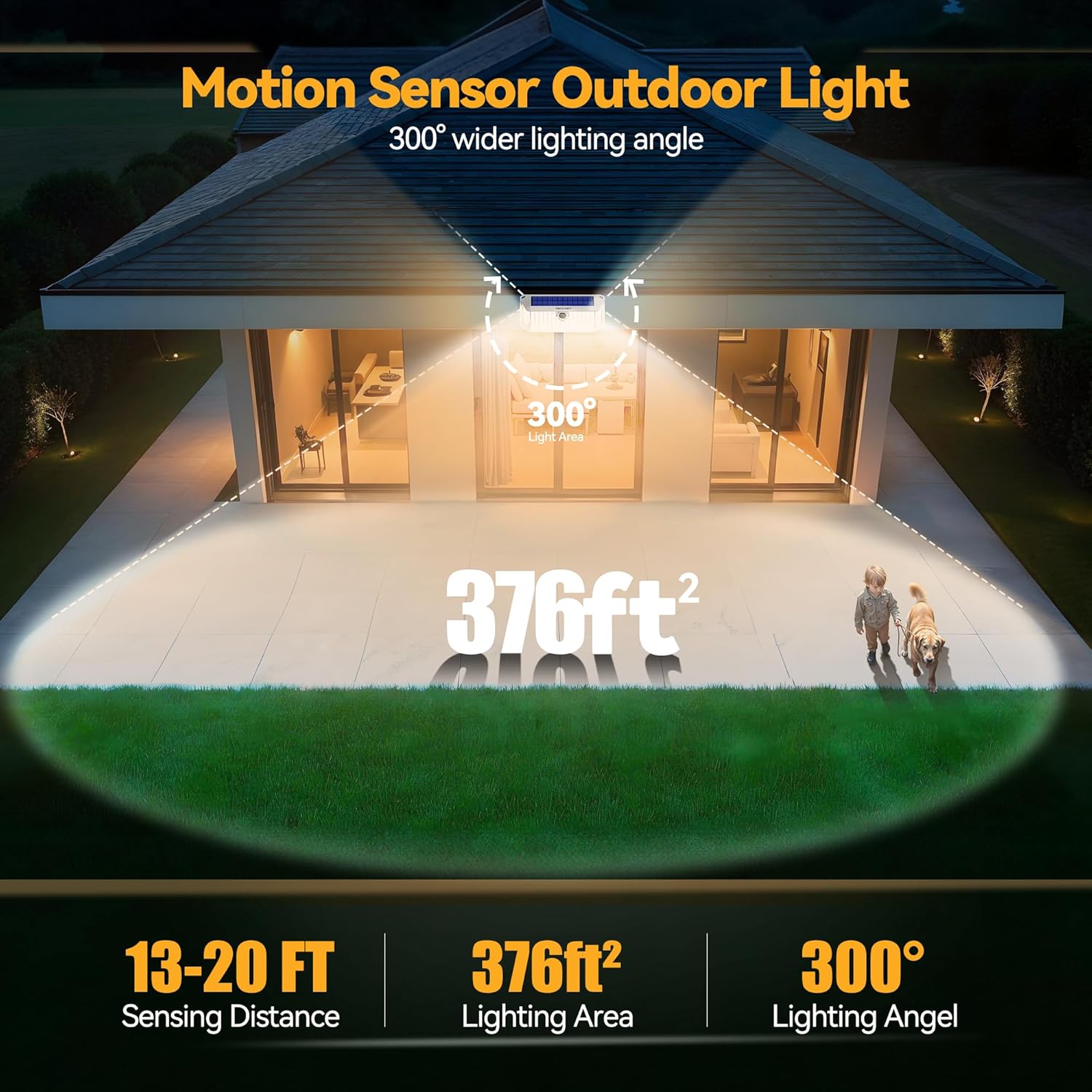 300° Wide Lighting Angle: TECKNET solar motion lights outdoor feature an expansive 300° lighting angle, the coverage is wider than the market average of 270° and illuminates an area of 376 FT². The solar motion lights outdoor wider lighting range makes every corner of your yard brighter, letting the children play in the garden more safely. When you come home at night, it can light up the way to the front door and garage, helping you get home safely and park more conveniently.