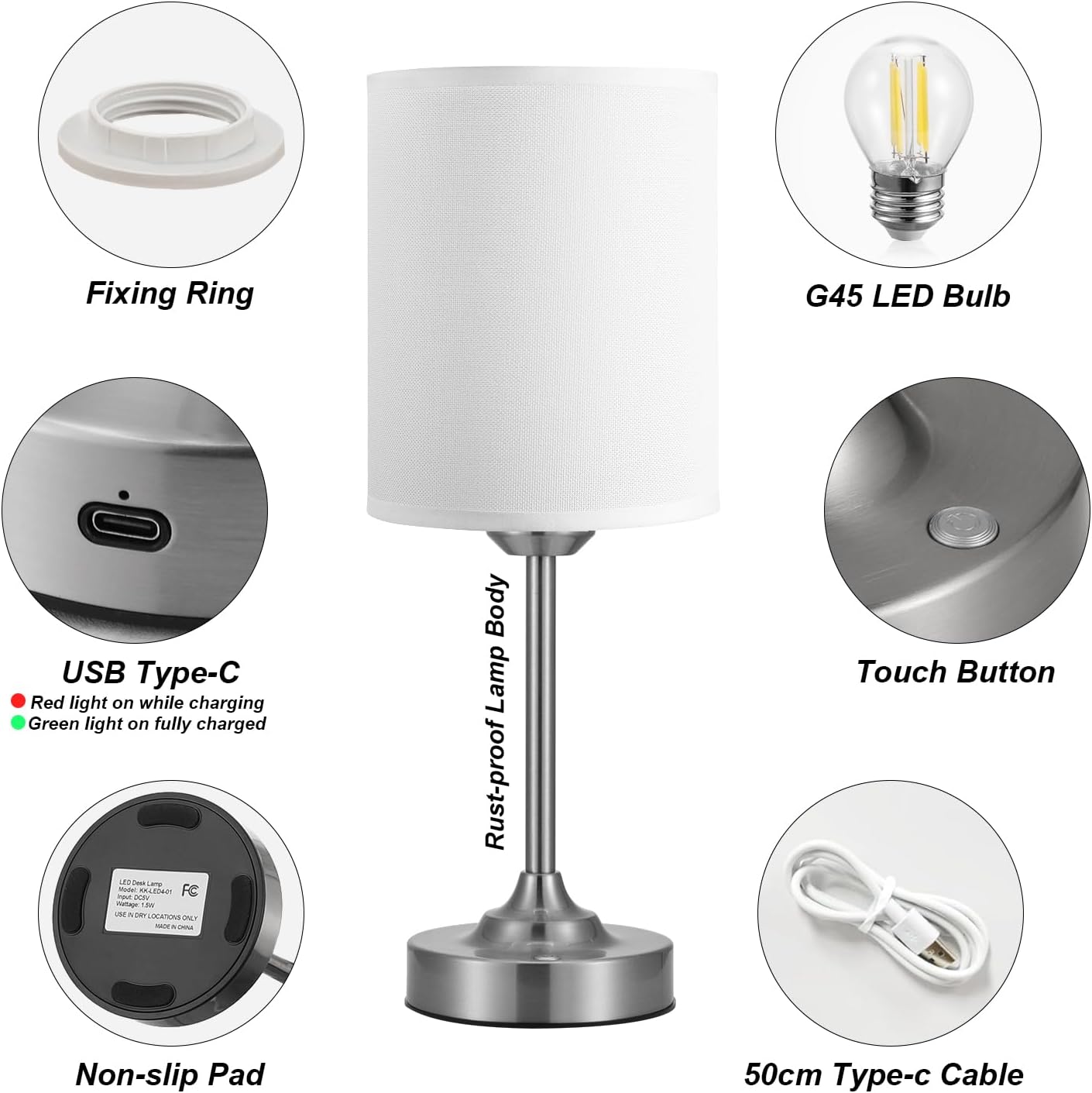 This rechargeable lamp includes G45 LED bulb, providing energy-efficient, long-lasting lighting. Features a USB-C charging port with indicator light (red for charging, green for full). Includes a fixing ring for secure assembly and a non-slip pad for stability. Comes with a 50cm Type-C cable for flexible placement. Ideal for bedside or desk use—stylish and practical