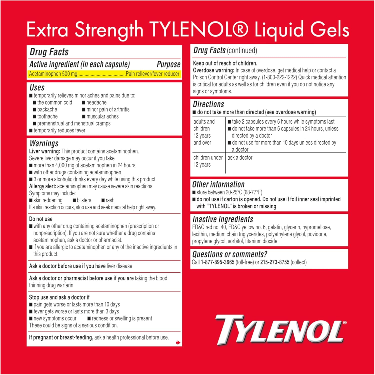18-count bottle of Tylenol Extra Strength Pain Reliever Liquid Gels with 500 mg of acetaminophen per capsule work fast to provide temporary relief of minor aches and pains, headaches, and help reduce fever