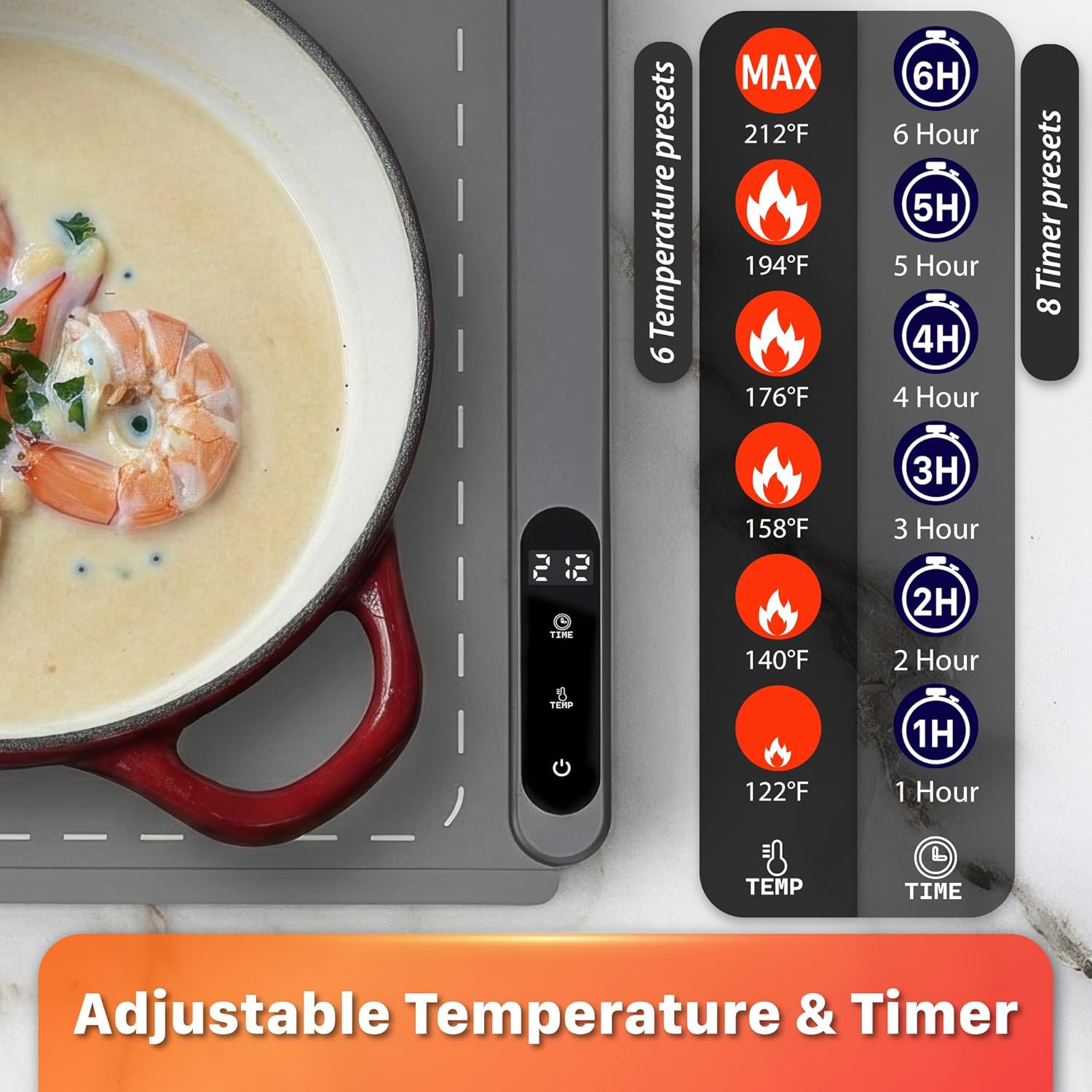 【Spacious 36″ x 15.8″ Surface with Precise Control】 The generous size of this adjustable warming mat easily accommodates several plates or platters at once, making it essential for large gatherings and holiday meals. Beyond its capacity, you enjoy full command over your service with precise temperature settings from 122°F to 212°F and a flexible 1-6 hour auto-off timer. It delivers the versatile, reliable performance you expect from a premium food warmer mat.
