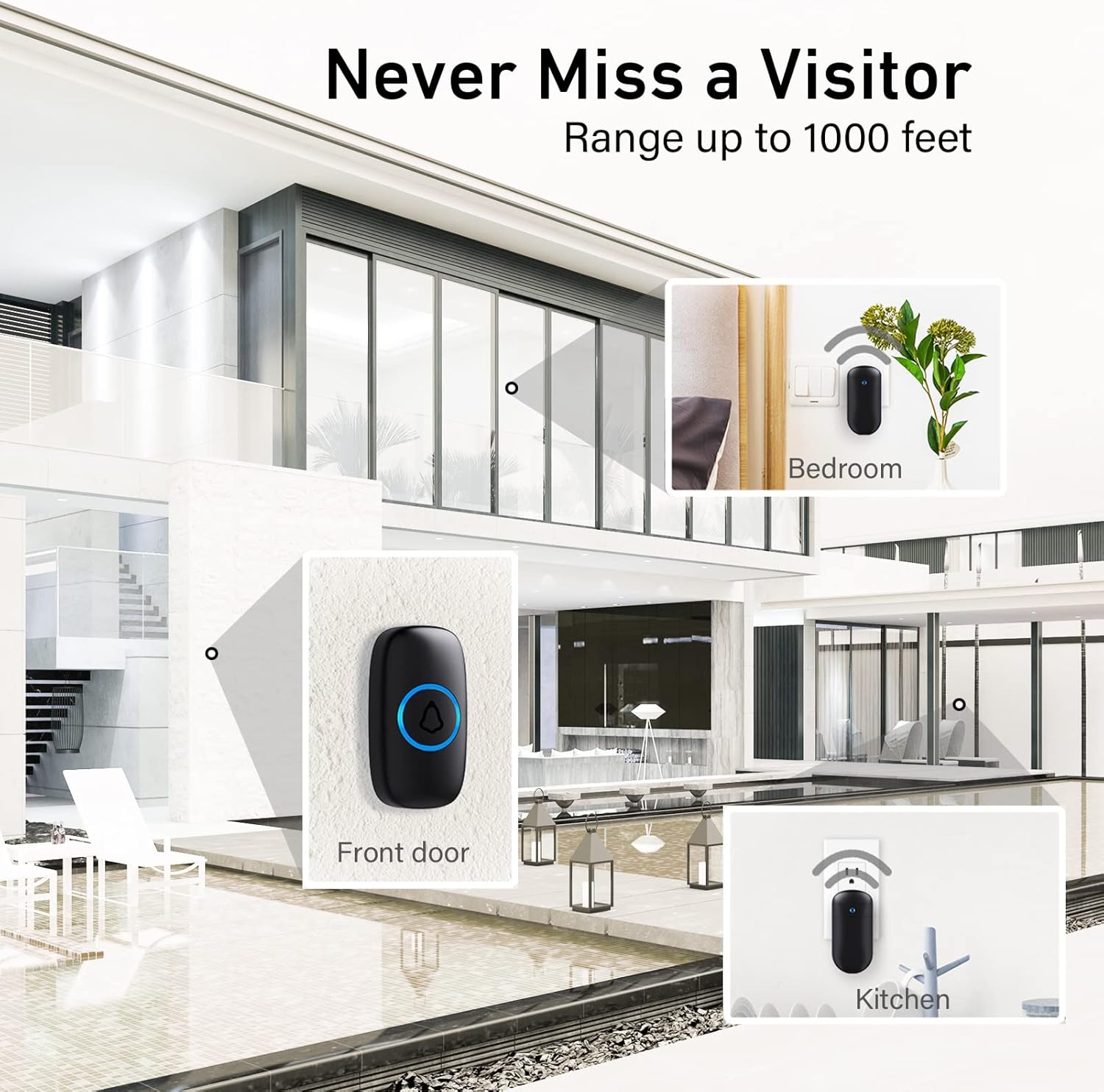 [Long Distance] This wireless remote-control doorbell with high-frequency electronic technology uses the FM signaling protocol, which provides robust anti-interference feature and one-to-one signal pairing. There’s no need to be concerned that the signal will not reach the door next to you. And in an obstacle-less environment, the detecting distance can reach up to 1000 feet.