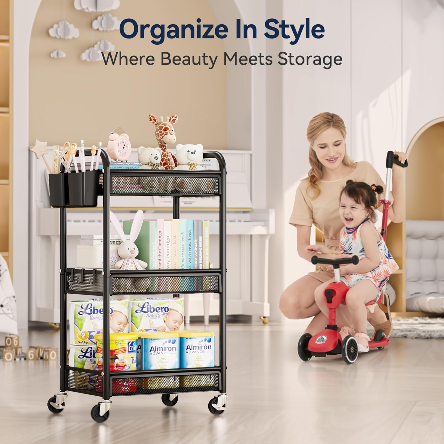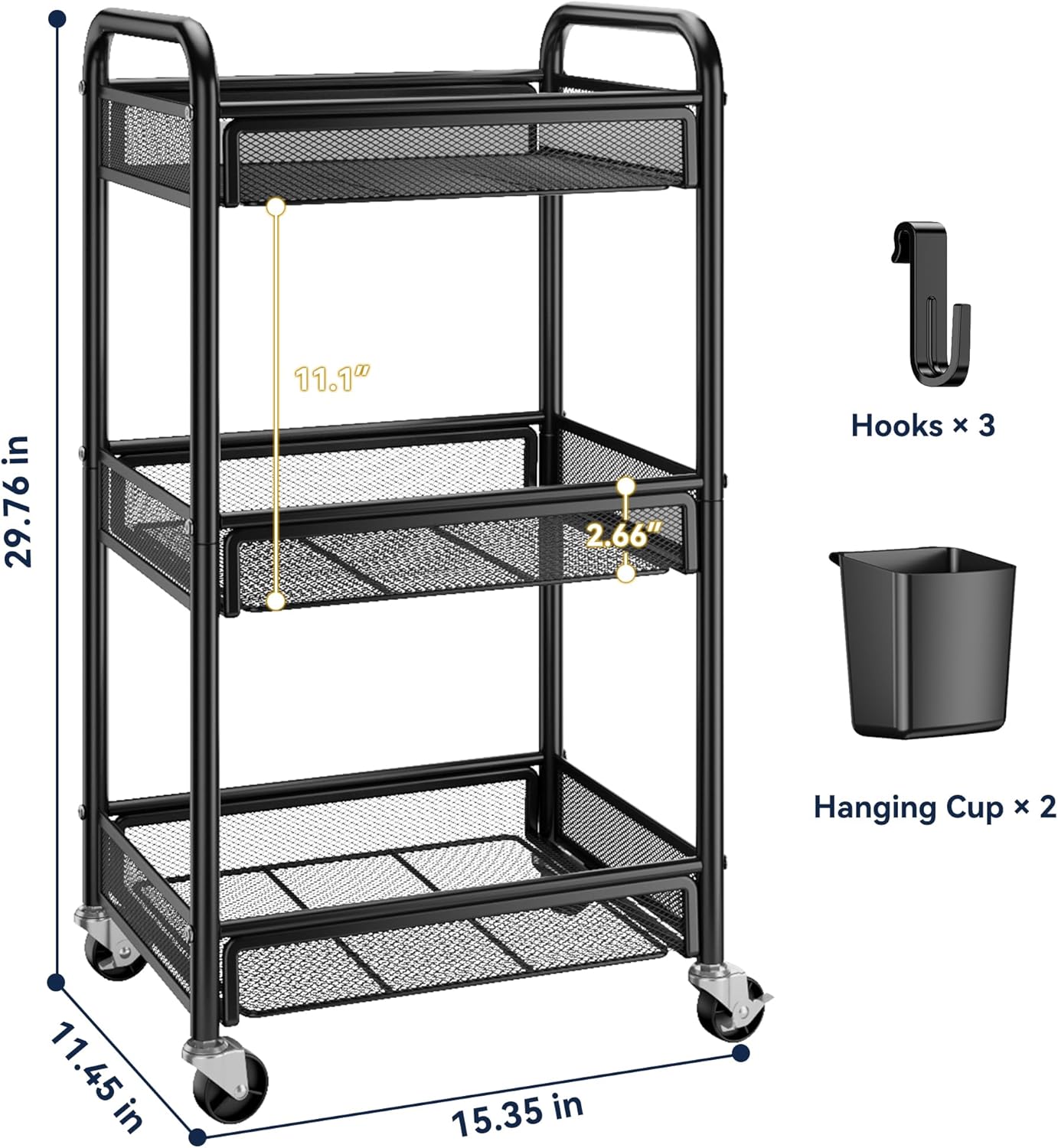 Larger Storage Capacity, Multifunctional Storage: Featuring 3 spacious metal baskets, 2 hanging cups, and 3 hooks, this three tier rolling carts with wheels offers extra storage for any occasion. Use it as baby cart, kitchen cart, bathroom cart, bedside cart, craft cart, art cart, snack cart, diaper cart, makeup cart, nail cart, cleaning cart or tool cart