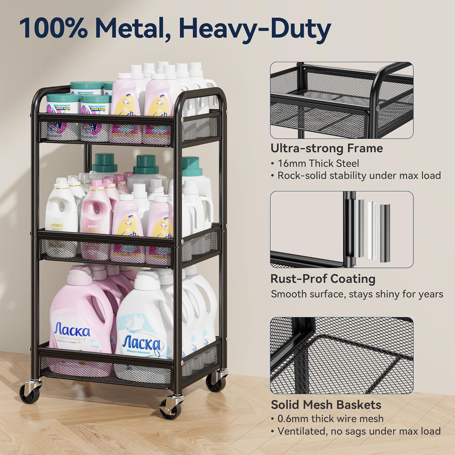 High-Quality Coating, Stylish and Durable: Elevate your space with the rolling storage cart on wheels that masters both style and substance. Featuring a high-gloss scratch-resistant finish, resists chips, corrosion, and daily wear while maintaining salon-worthy aesthetics