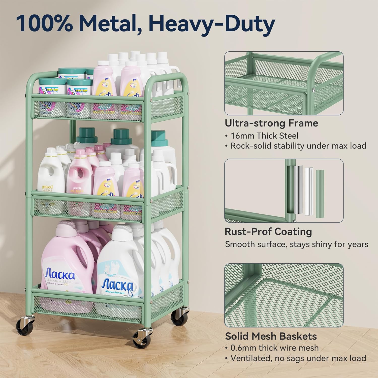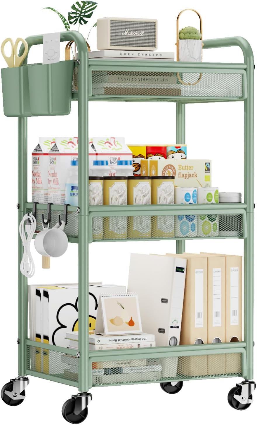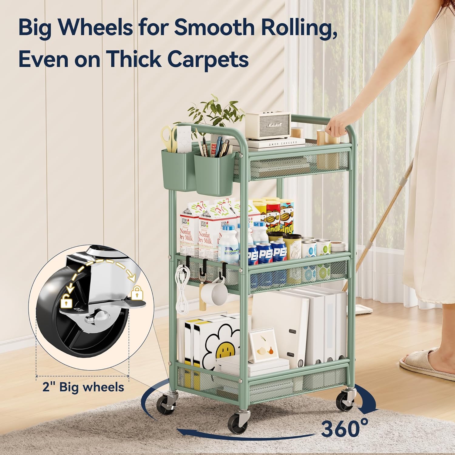 YASONIC 3 Tier Rolling Cart – Metal Utility Storage Carts with Wheels, Craft Carts Organizer with Hanging Cups, Hooks, Mesh Basket for Bedside Kitchen Office Art, Green