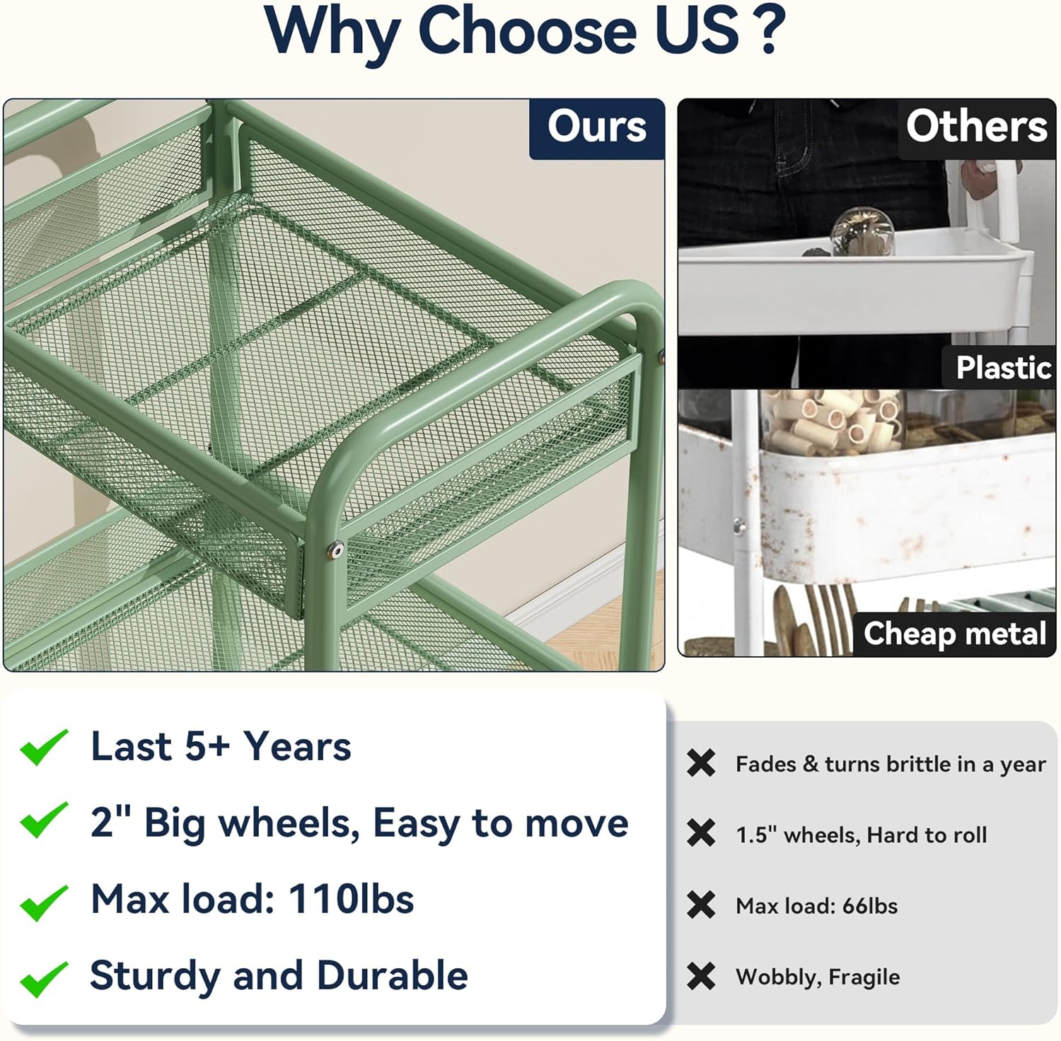 Larger Storage Capacity, Multifunctional Storage: Featuring 3 spacious metal baskets, 2 hanging cups, and 3 hooks, this three tier rolling carts with wheels offers extra storage for any occasion. Use it as baby cart, kitchen cart, bathroom cart, bedside cart, craft cart, art cart, snack cart, diaper cart, makeup cart, nail cart, cleaning cart or tool cart