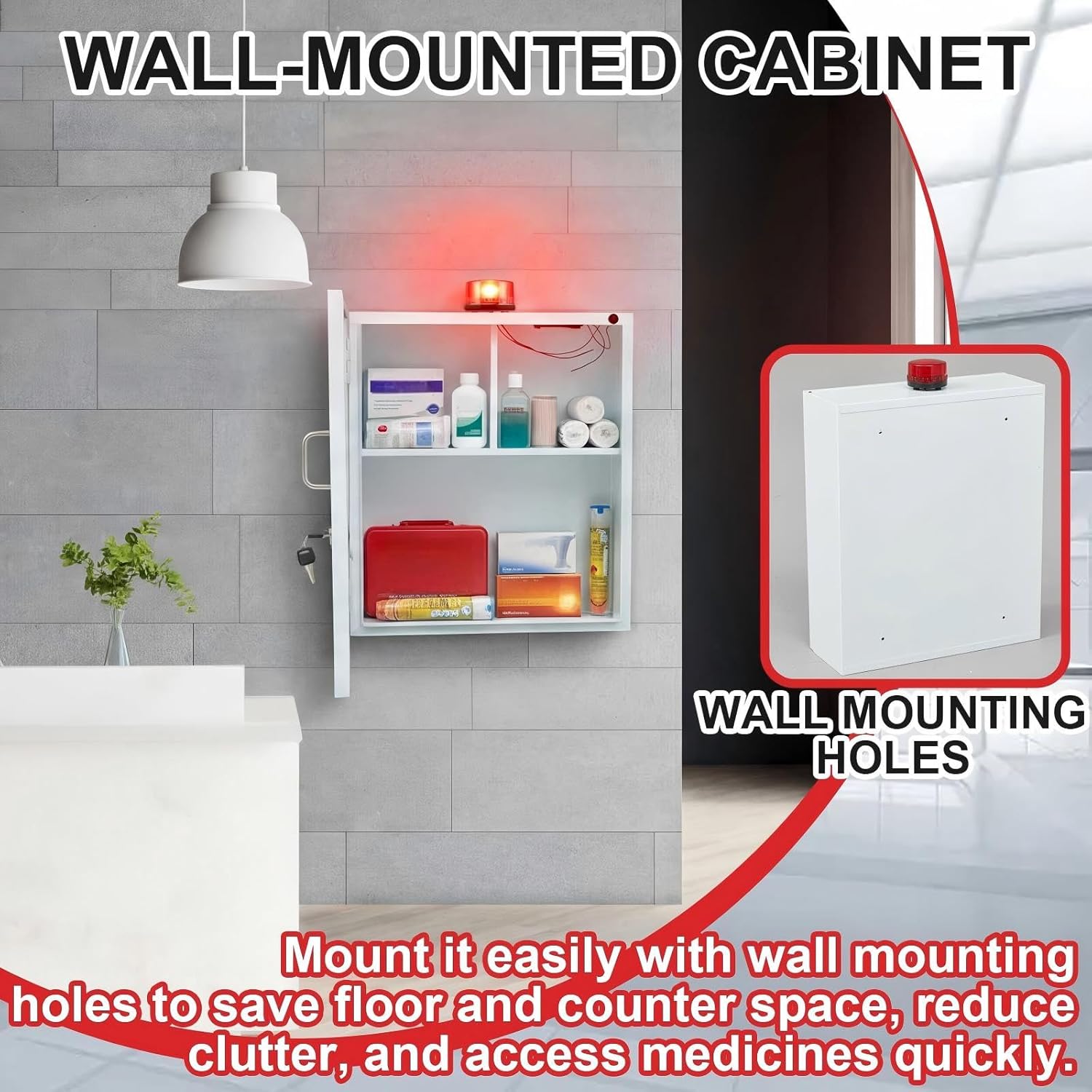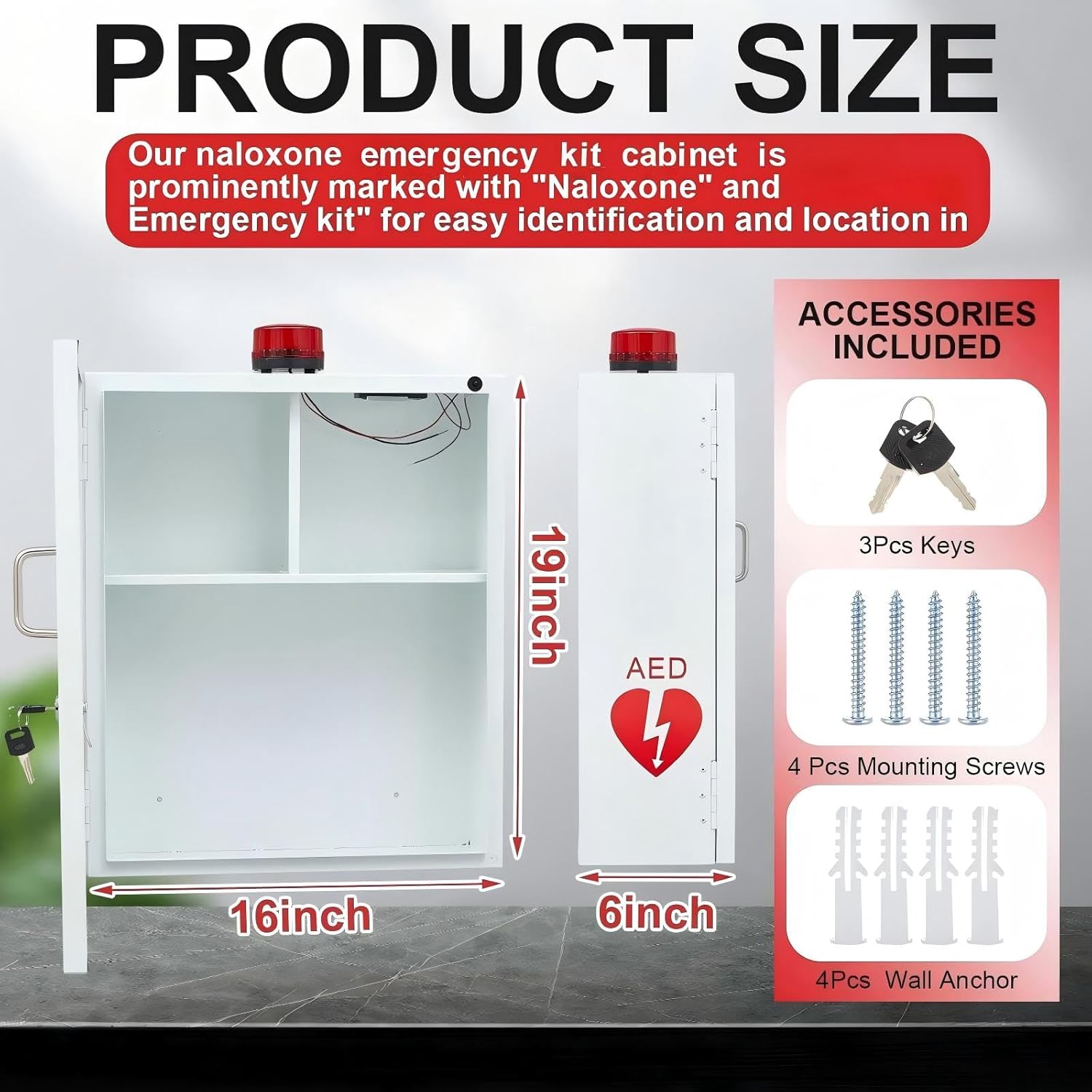 You Will Receive: wall-mounted emergency medical station cabinet with audible and visual alarm, measuring 19” H x 16” W x 6” D; The cabinet is made of galvanized steel, ensuring durability; It includes the cabinet, alarm, key, and necessary screws and expansion bolts for easy operation and installation